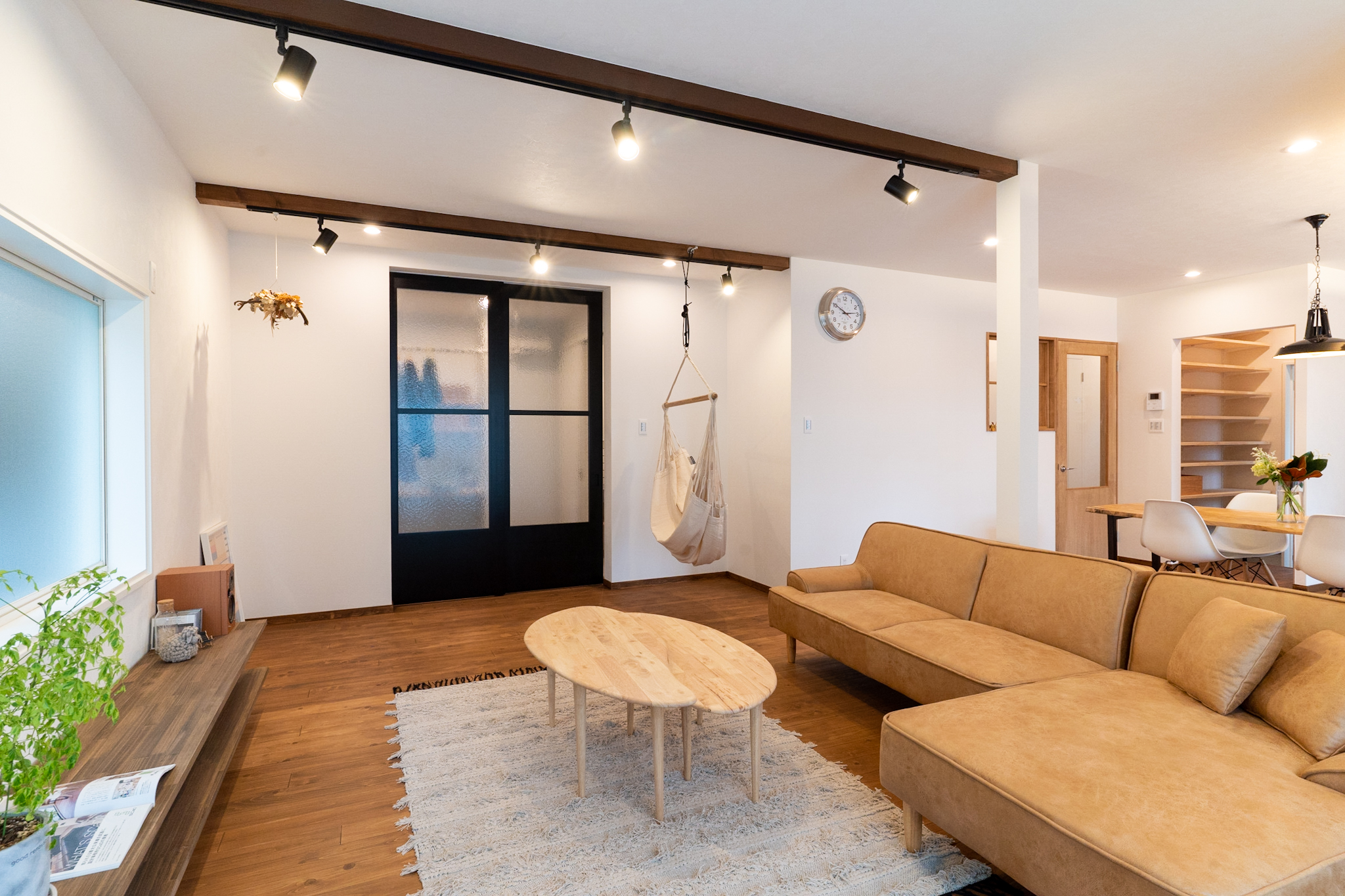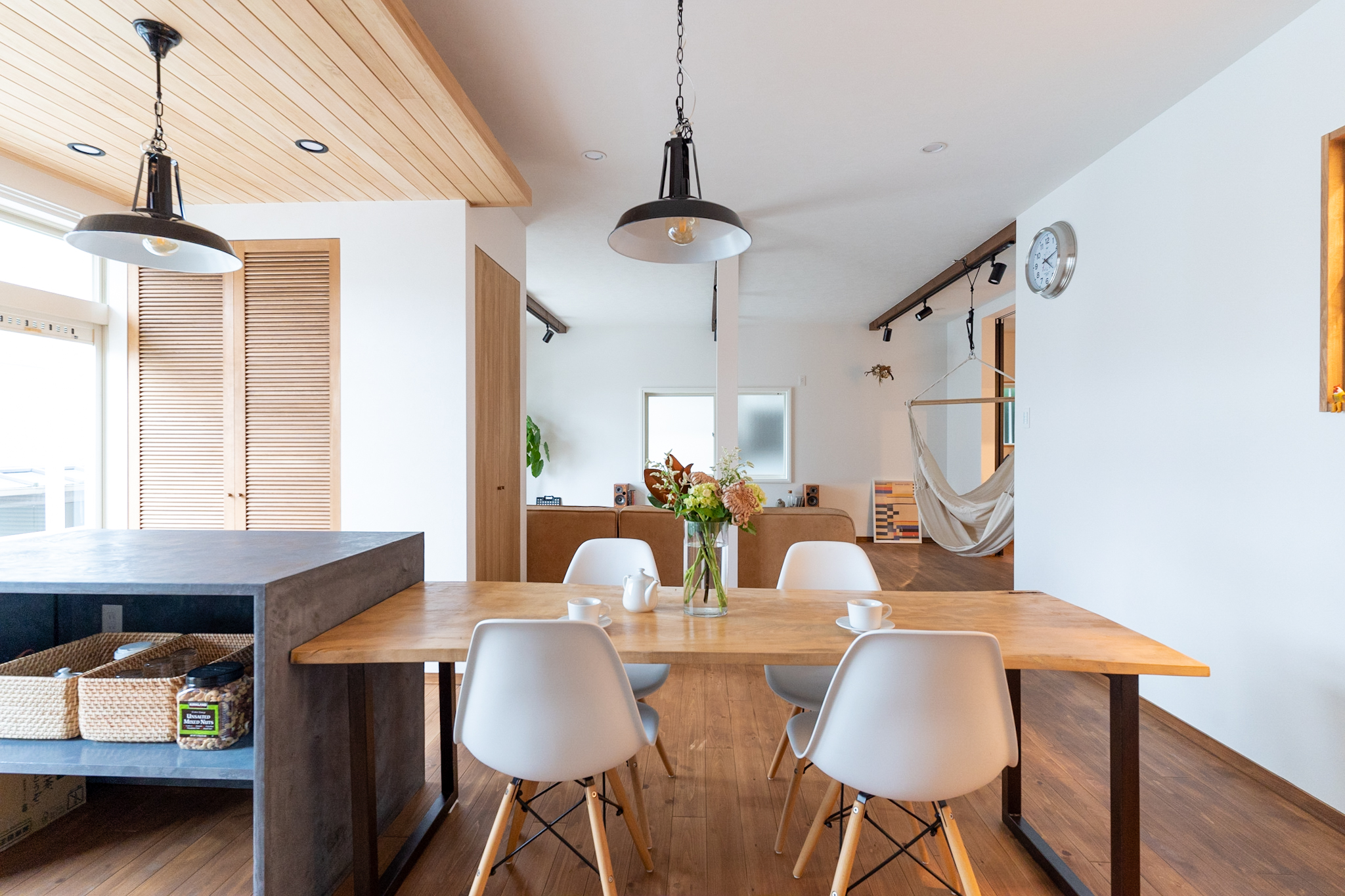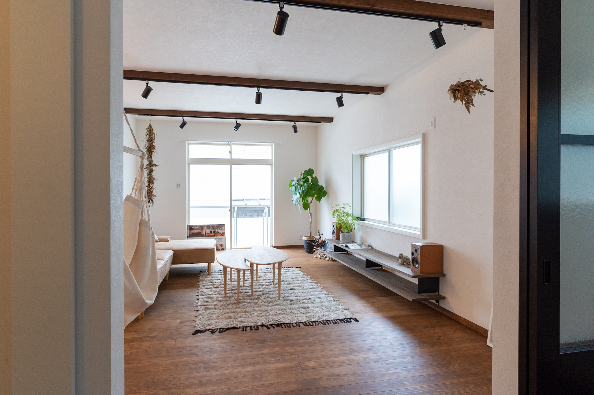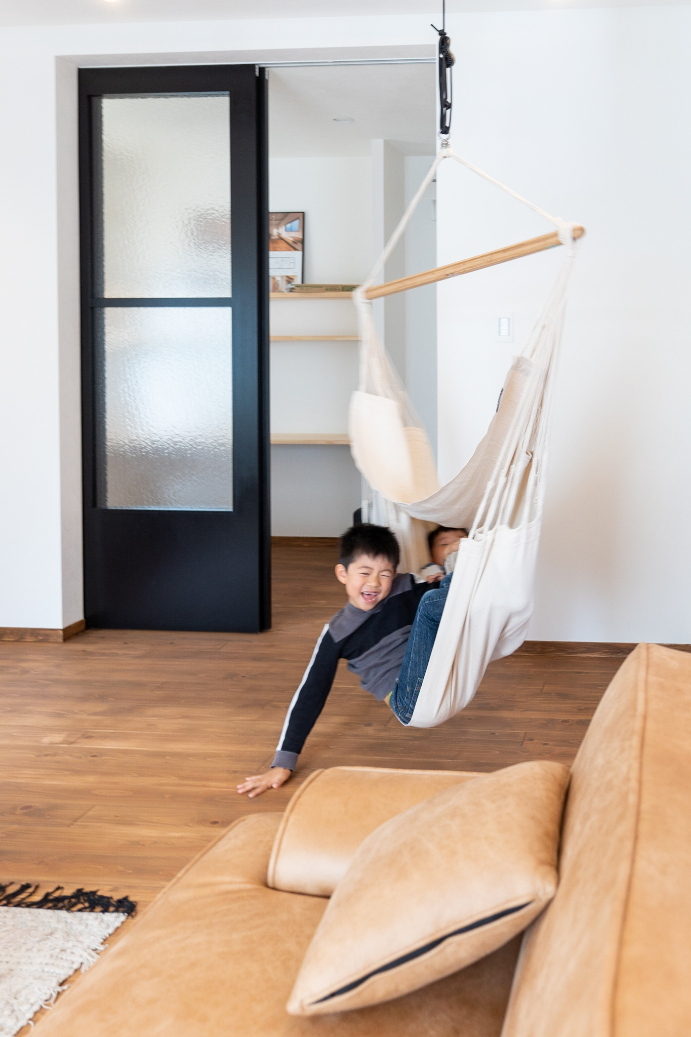 既存の梁がでるキッチン部分は下がり天井に間接照明をつけデザインとして取り込み、またLDKには大人も子供も楽しめるハンモックを設置しました。
