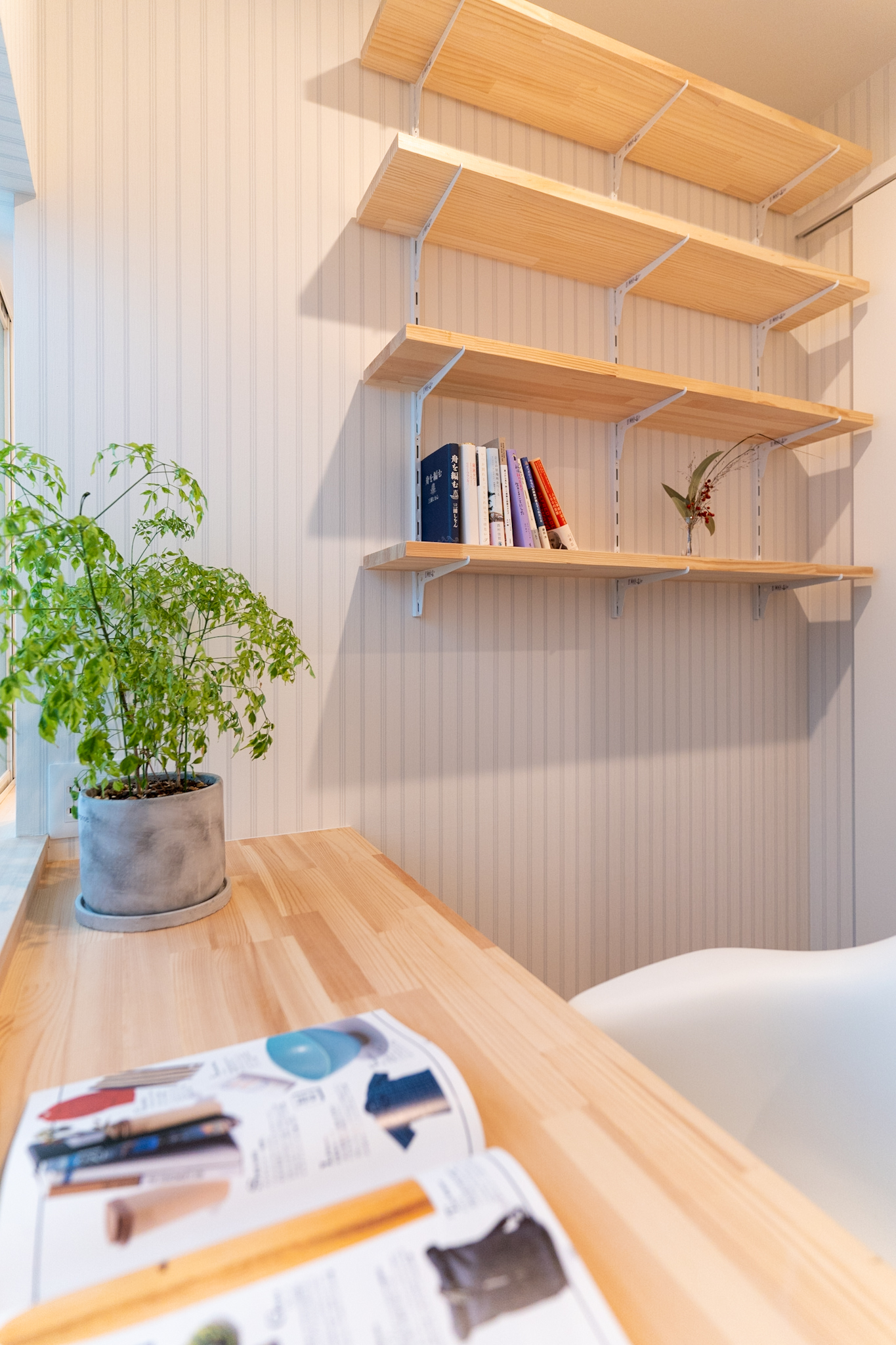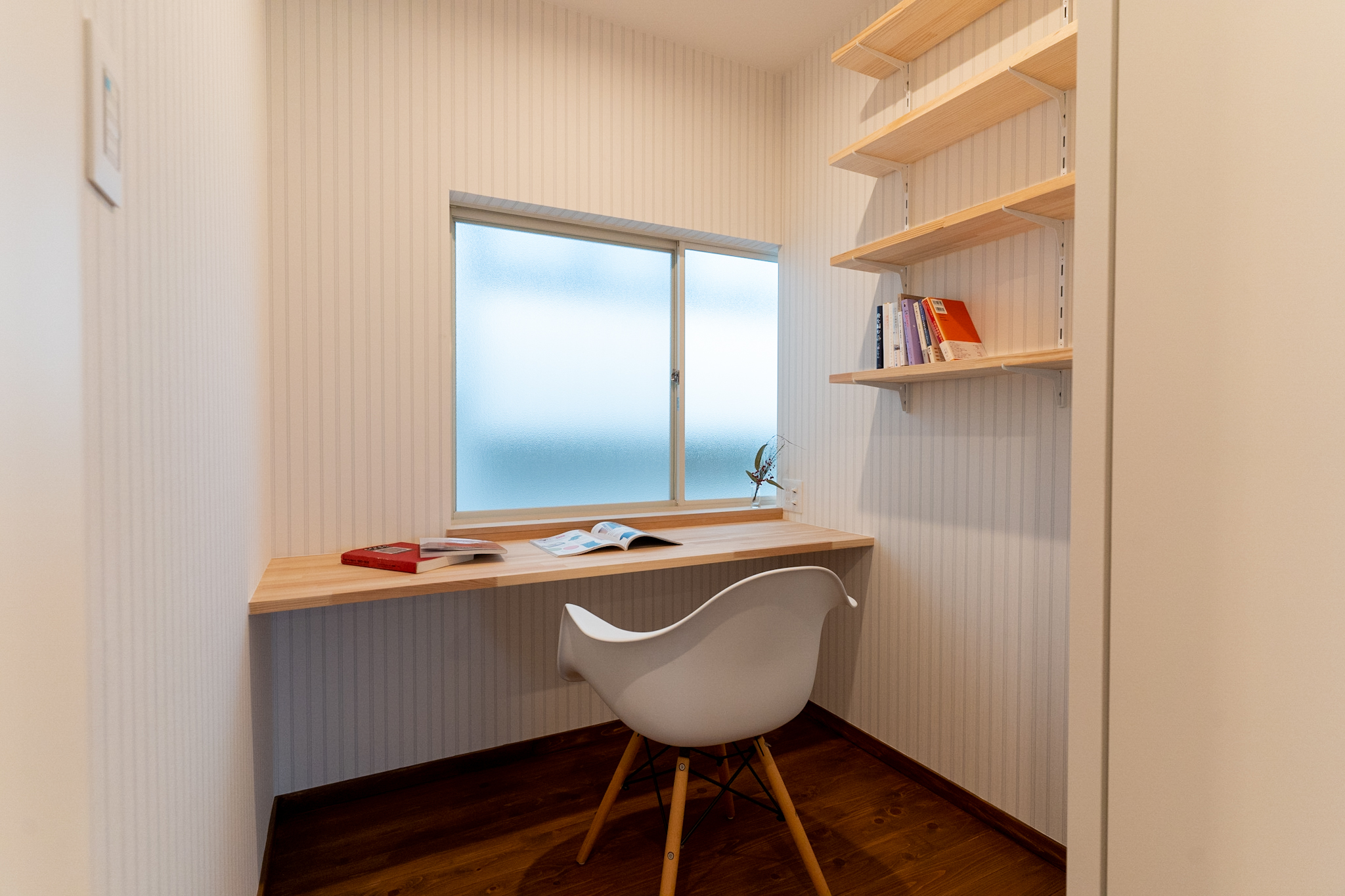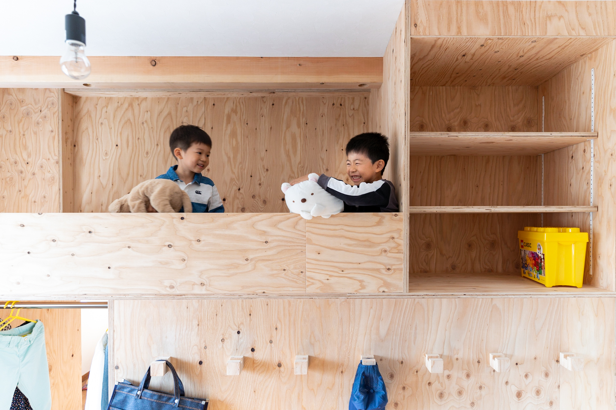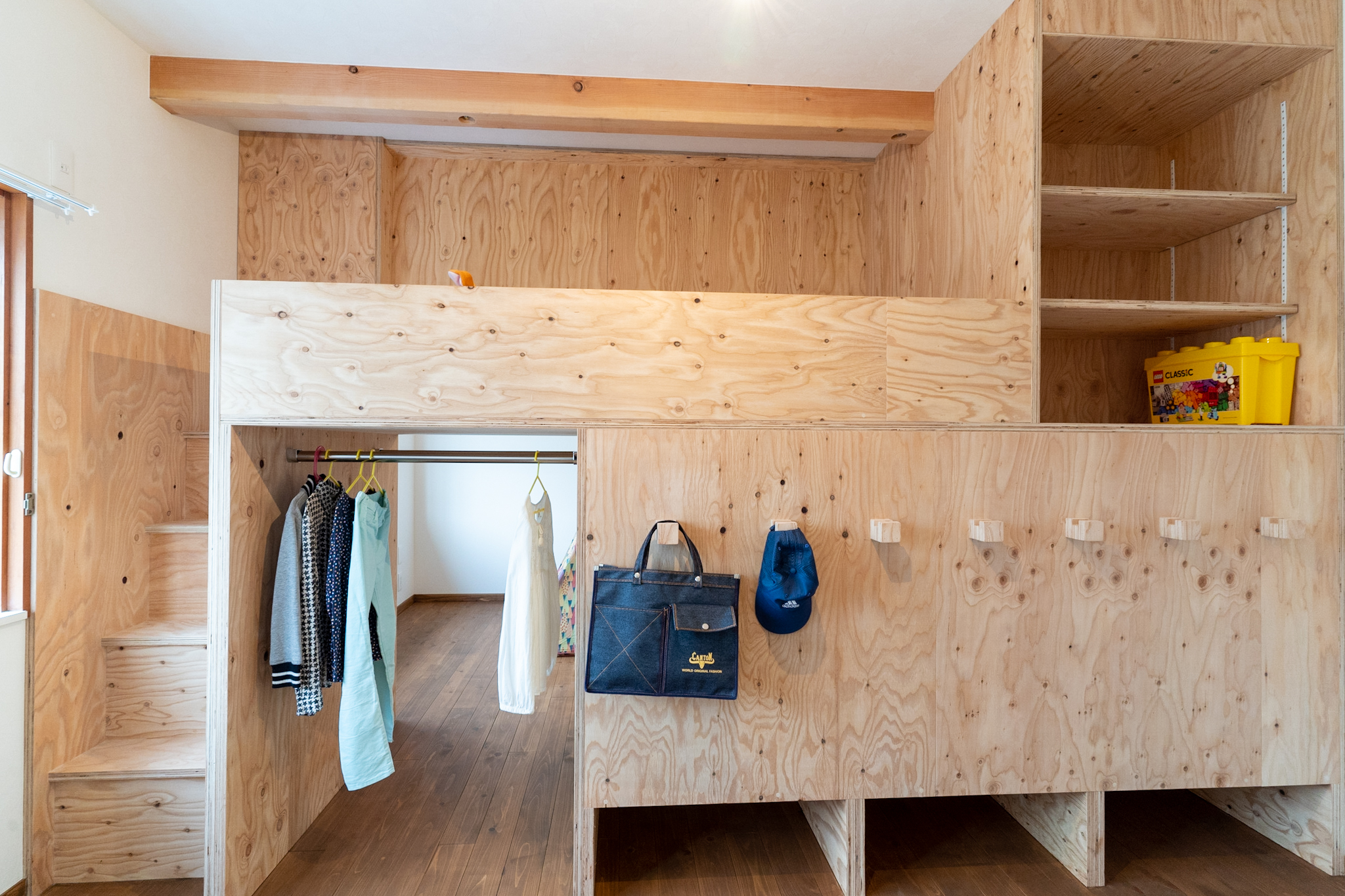 2Fの子供部屋には、子供たちが大喜びしてくれた造作ベッド。部屋の中心を緩やかに区切りながら行き来できるようにし、空間を無駄にすることなく収納もたっぷりと確保しました。2Fにはこもり感のある書斎部屋もあり、在宅ワークや集中したい時に大活躍です。