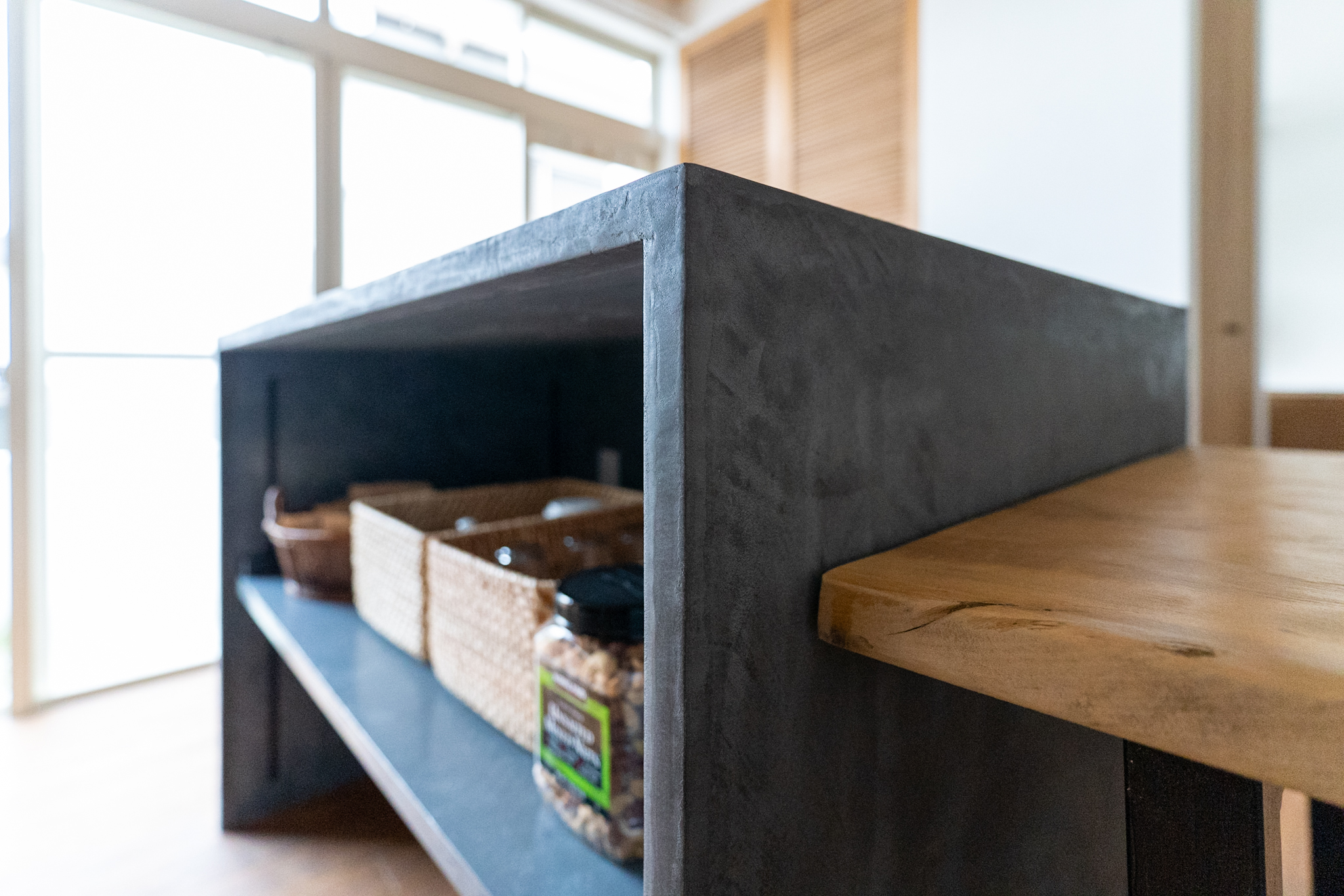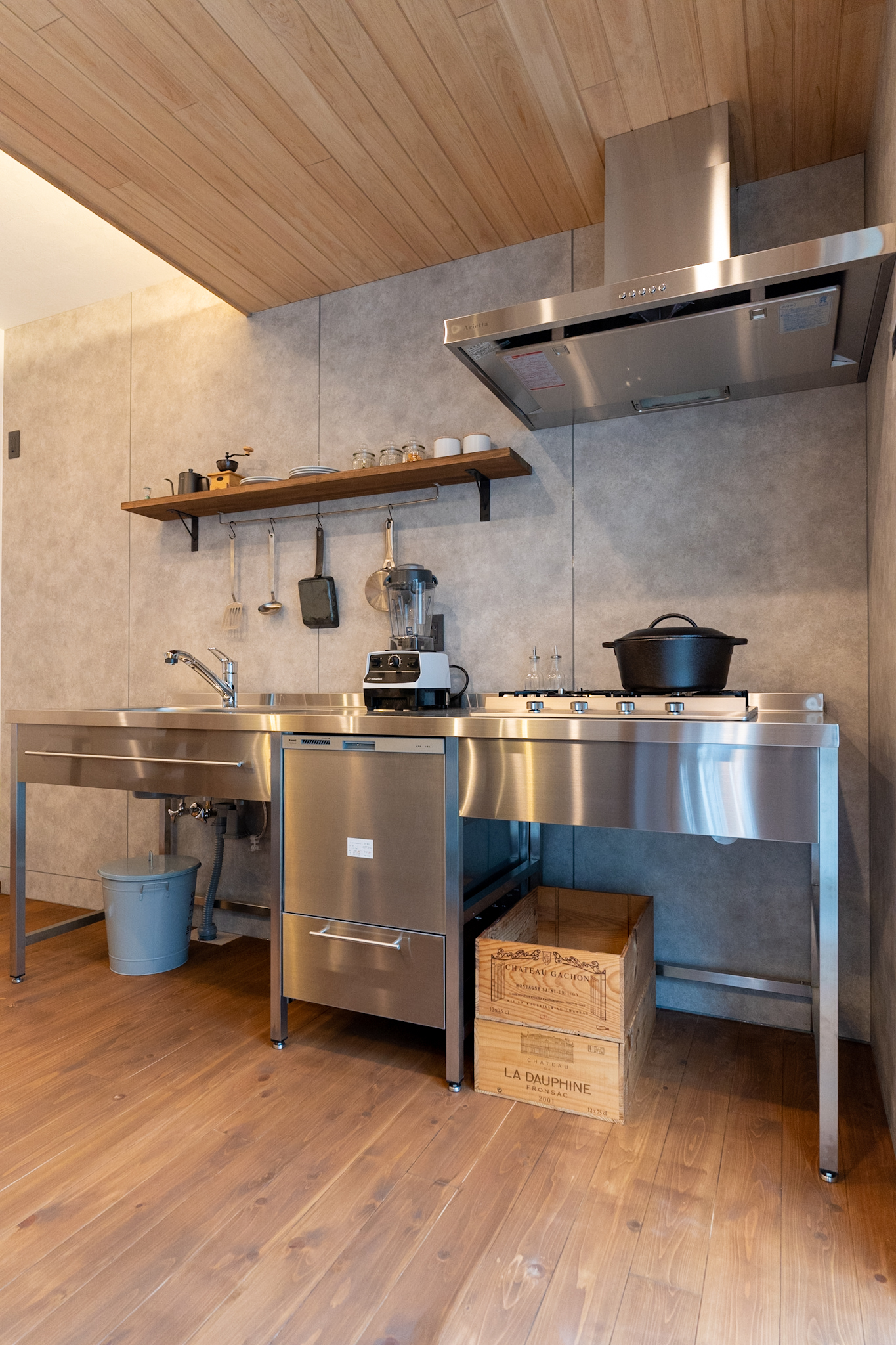 キッチンはカスタマイズ可能なステンレスキッチン、モールテックスの造作台、向かい側にパントリーの収納をつくりました。