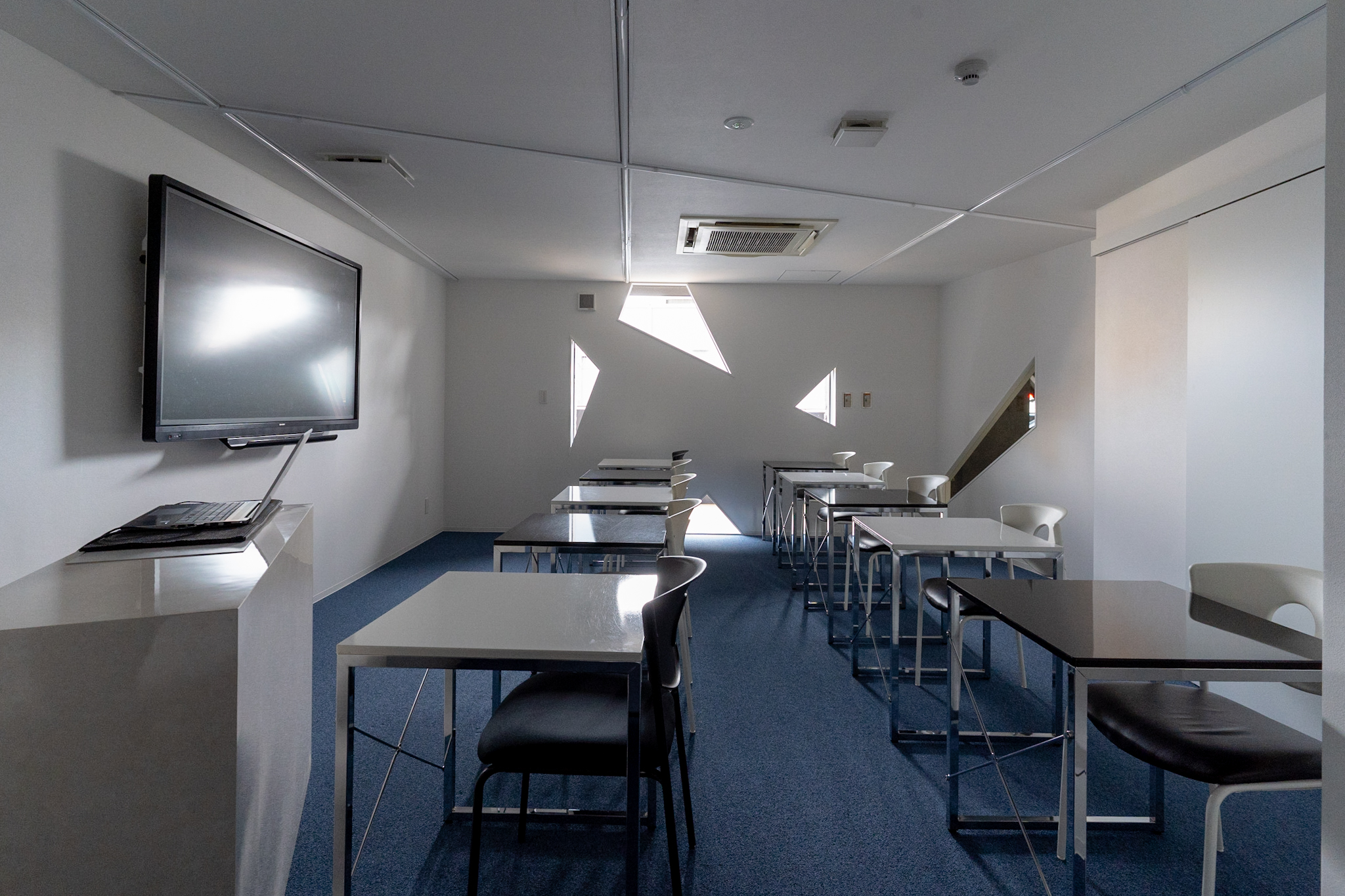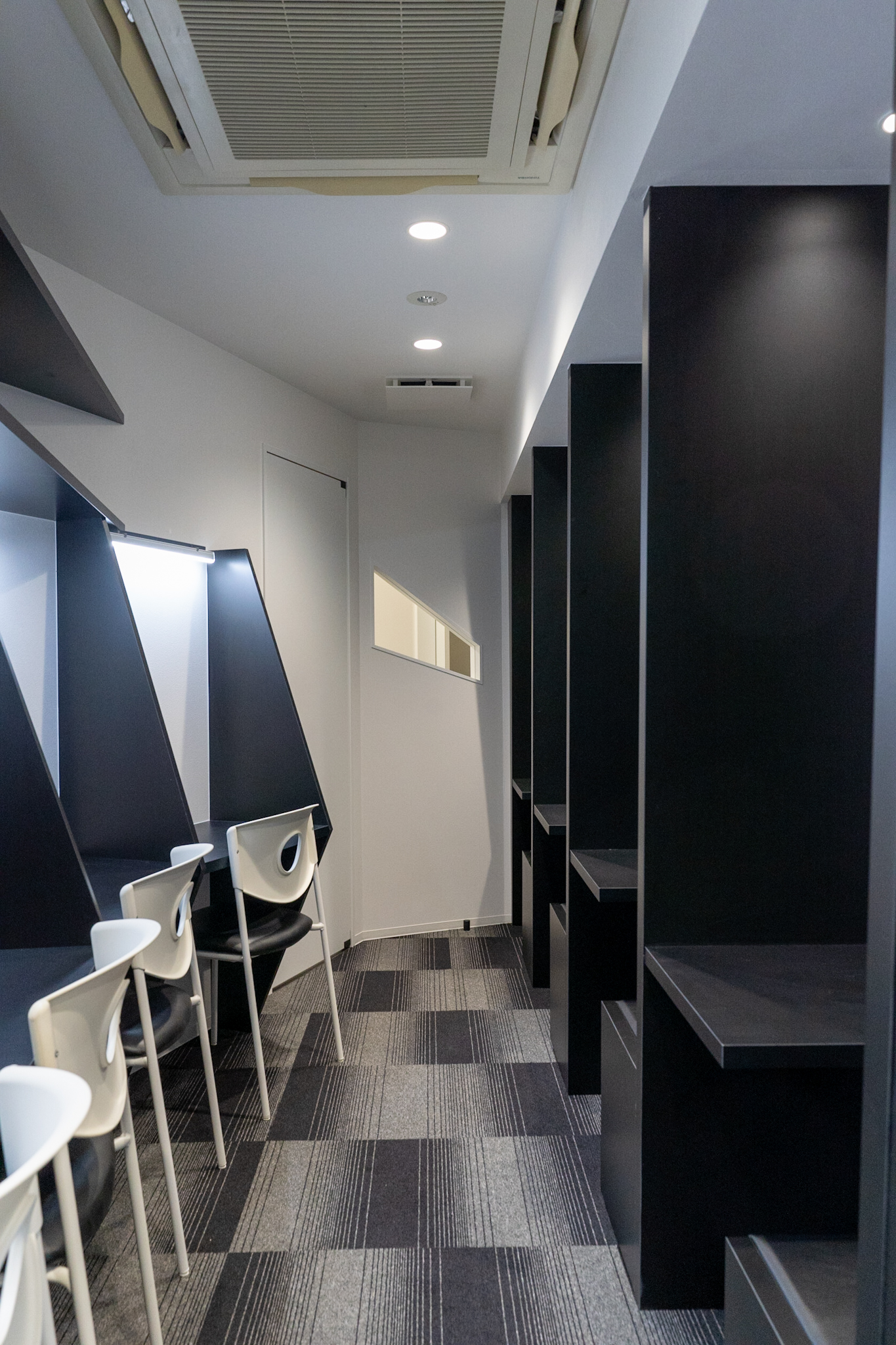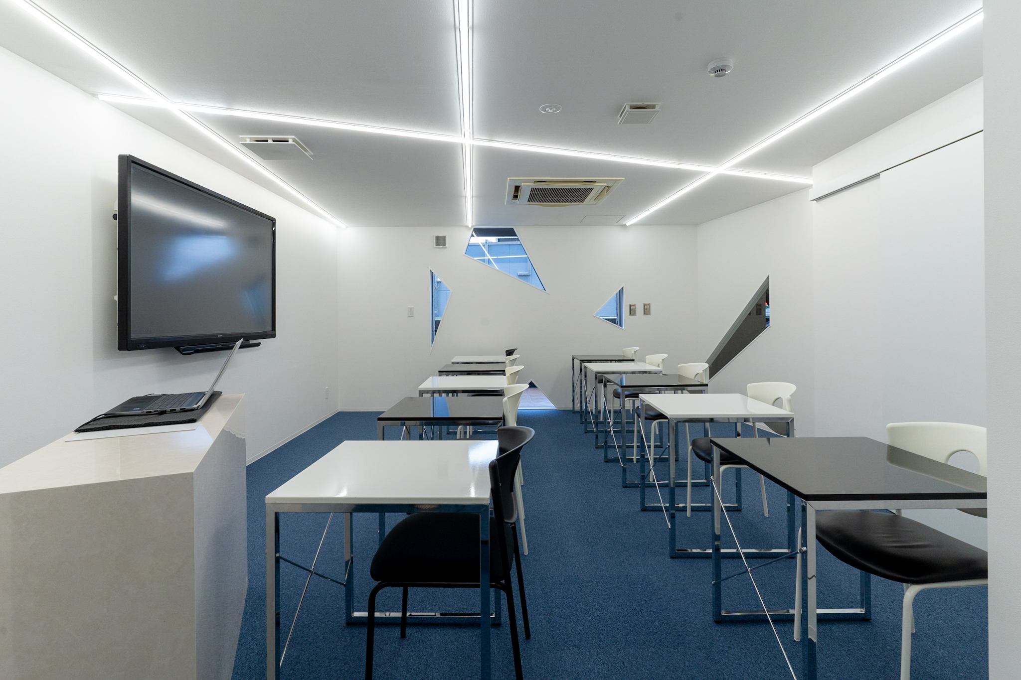 白と黒を基調とし、スタイリッシュで落ち着いた空間に。外部や内部の変形窓からは、生徒様の様子も垣間見れるようになっています。