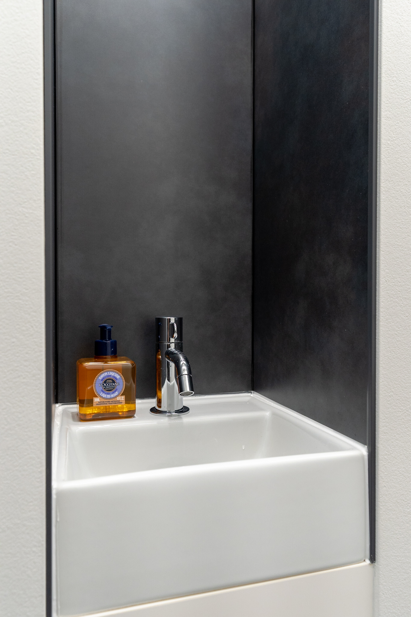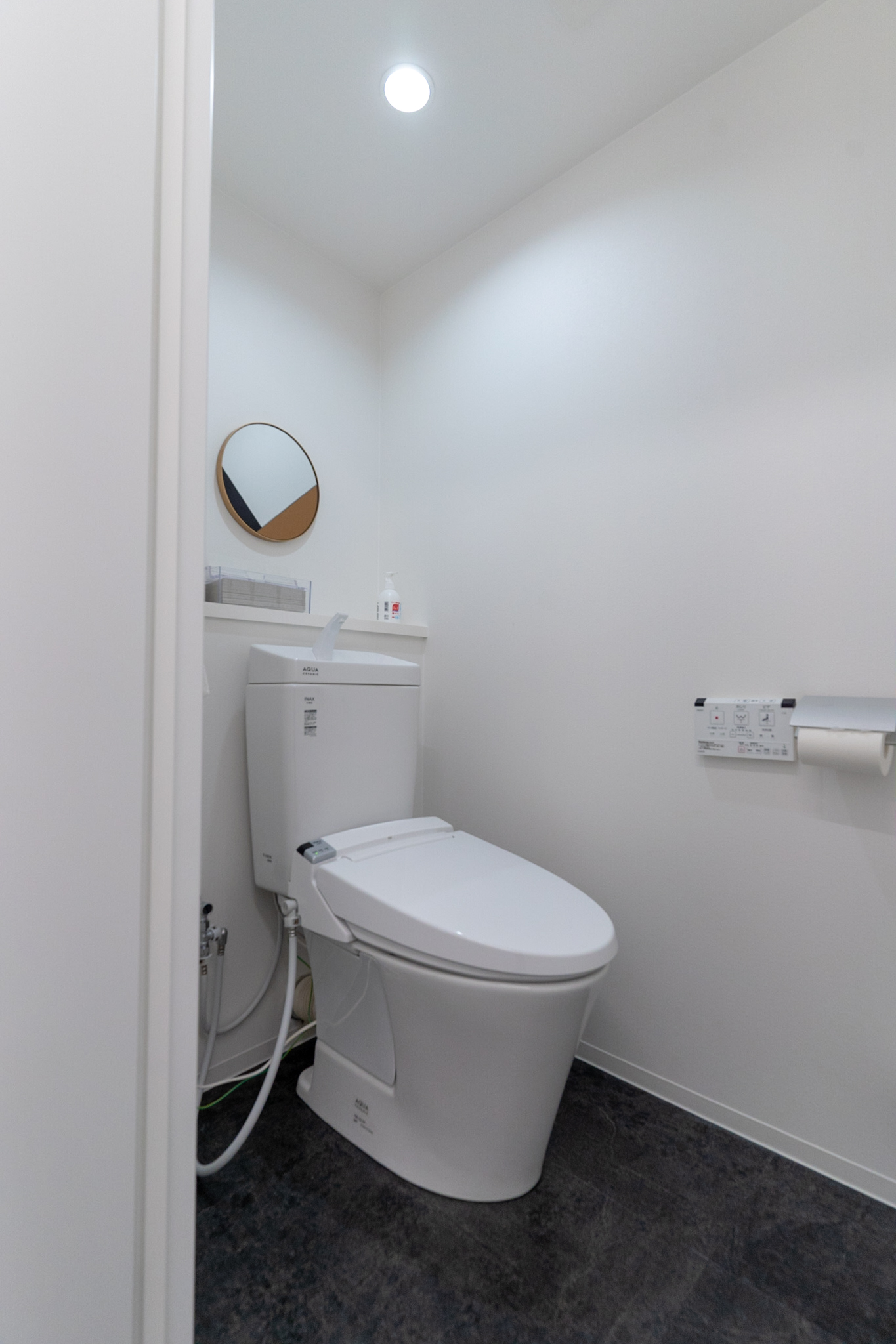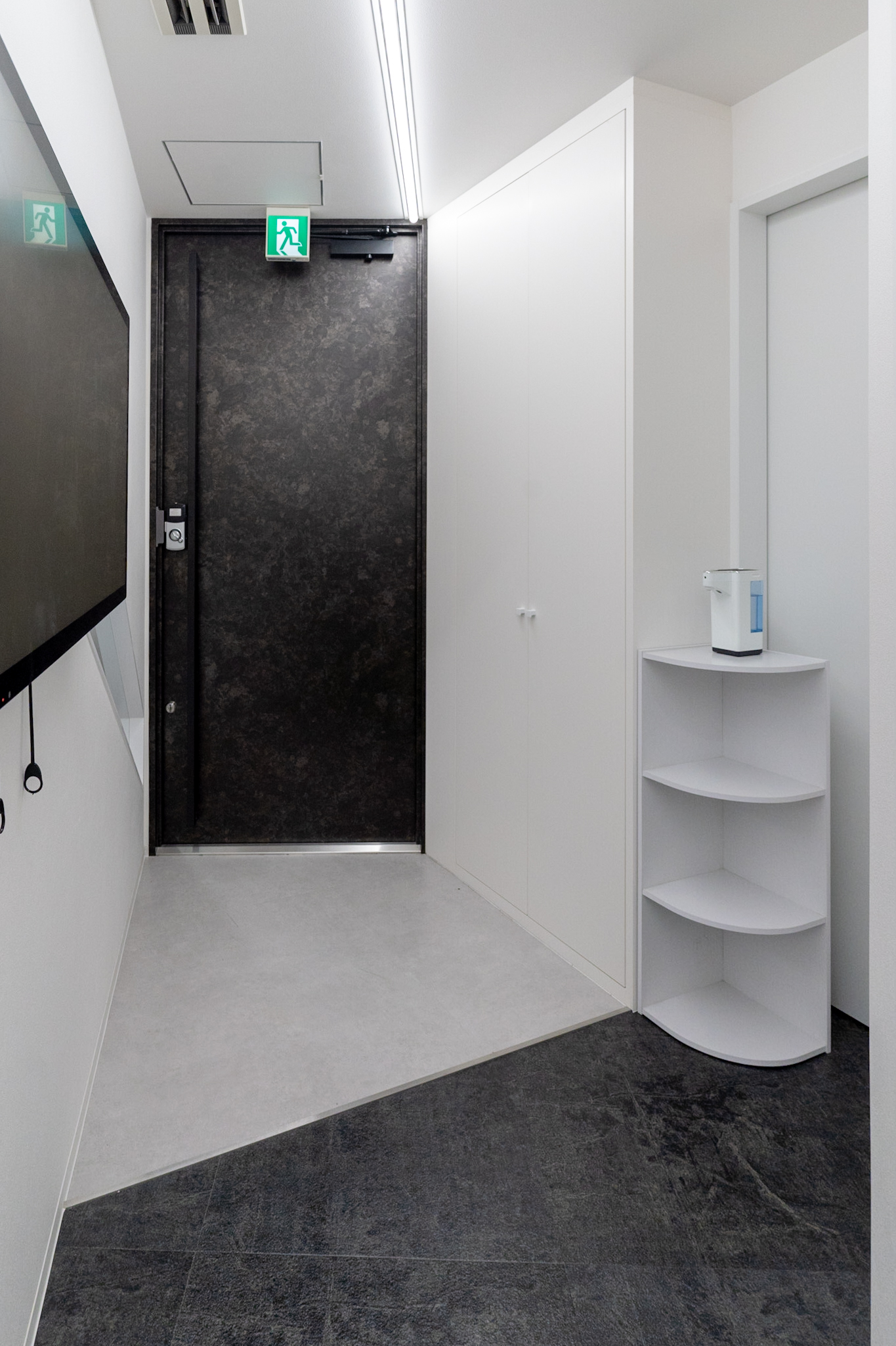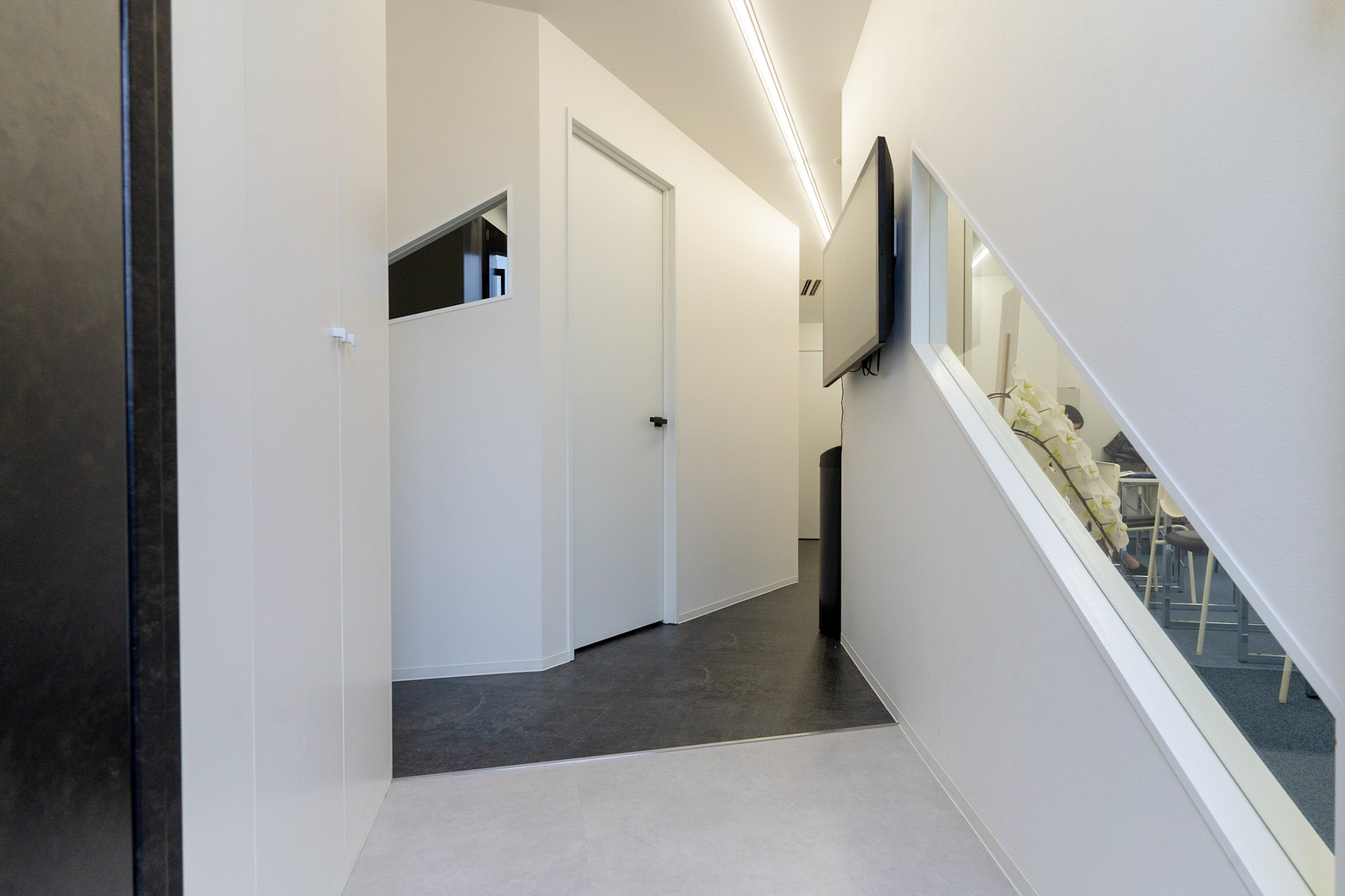 白と黒を基調とし、スタイリッシュで落ち着いた空間に。外部や内部の変形窓からは、生徒様の様子も垣間見れるようになっています。