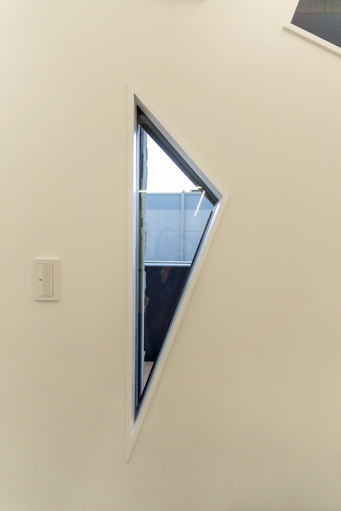 外観は三角形、四角形、五角形を組み合わせ、互い違いに浮かせながら立体感を出し、間に窓も挟み込んだ不規則な形が魅力の外観デザインに仕上げました。また間取りも同様に不規則なデザインを取り入れています。