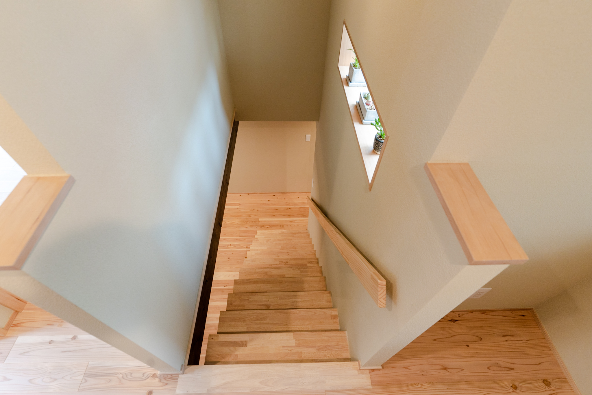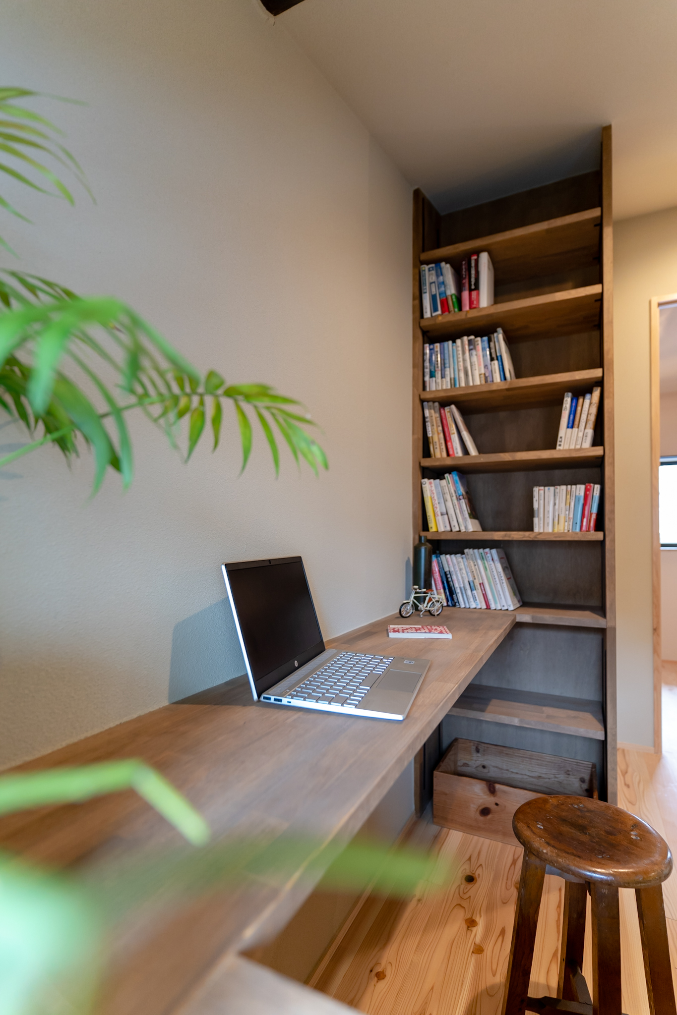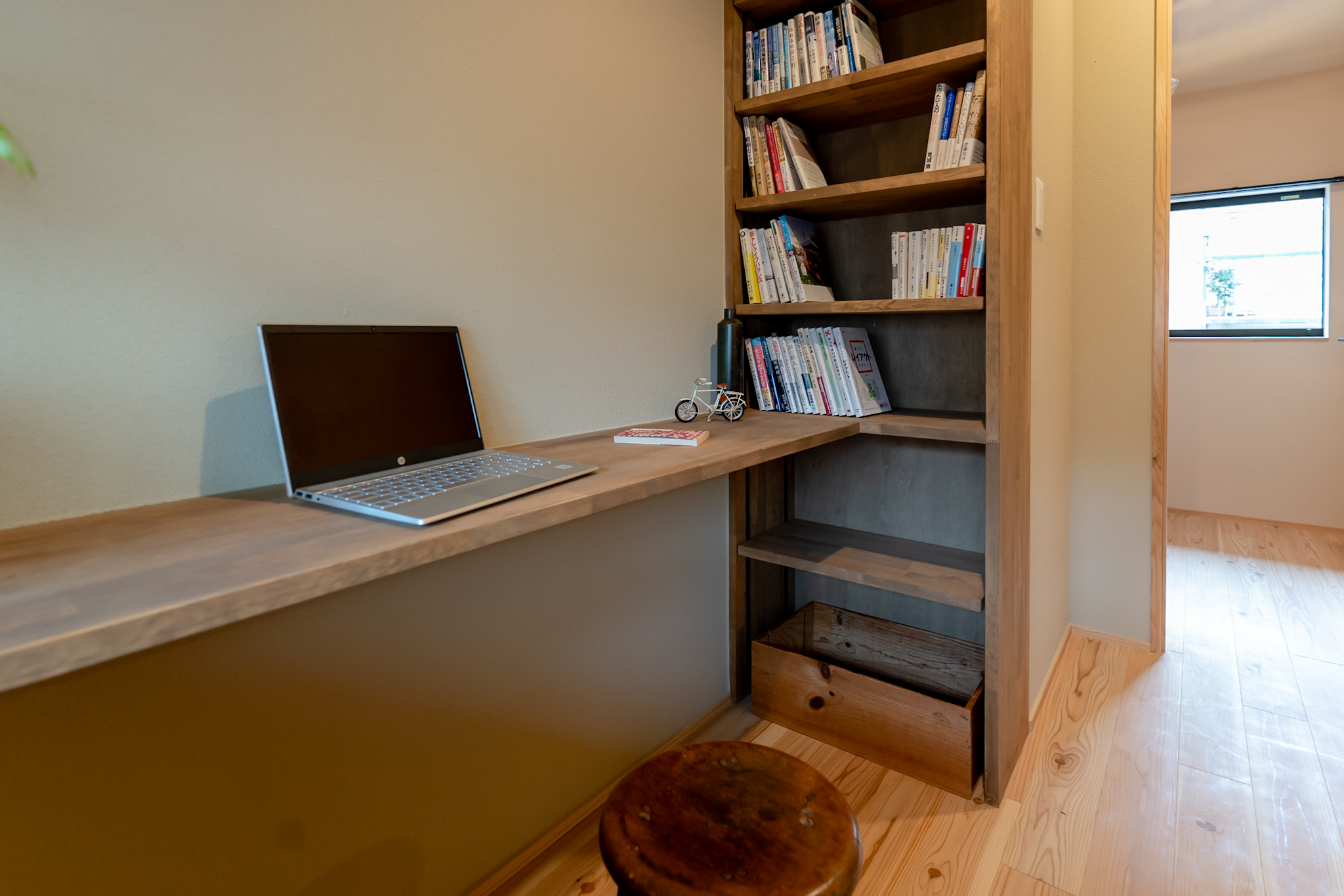 床はスギの無垢フローリングを使用。リビング階段を上がってすぐの場所には本棚を備えた書斎スペース。ゆったりと集中した時間を過ごすことができる。