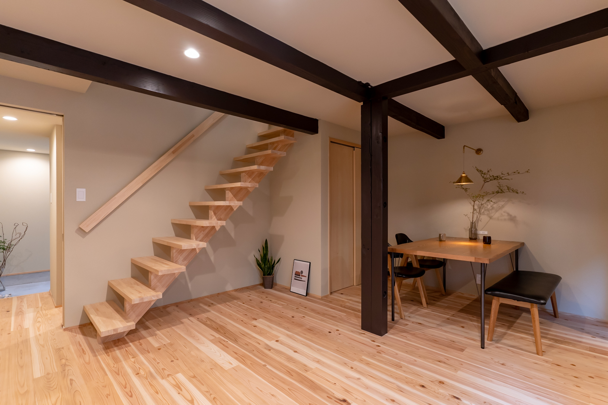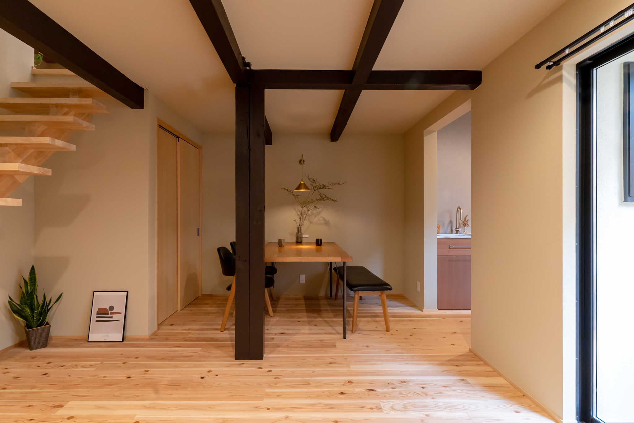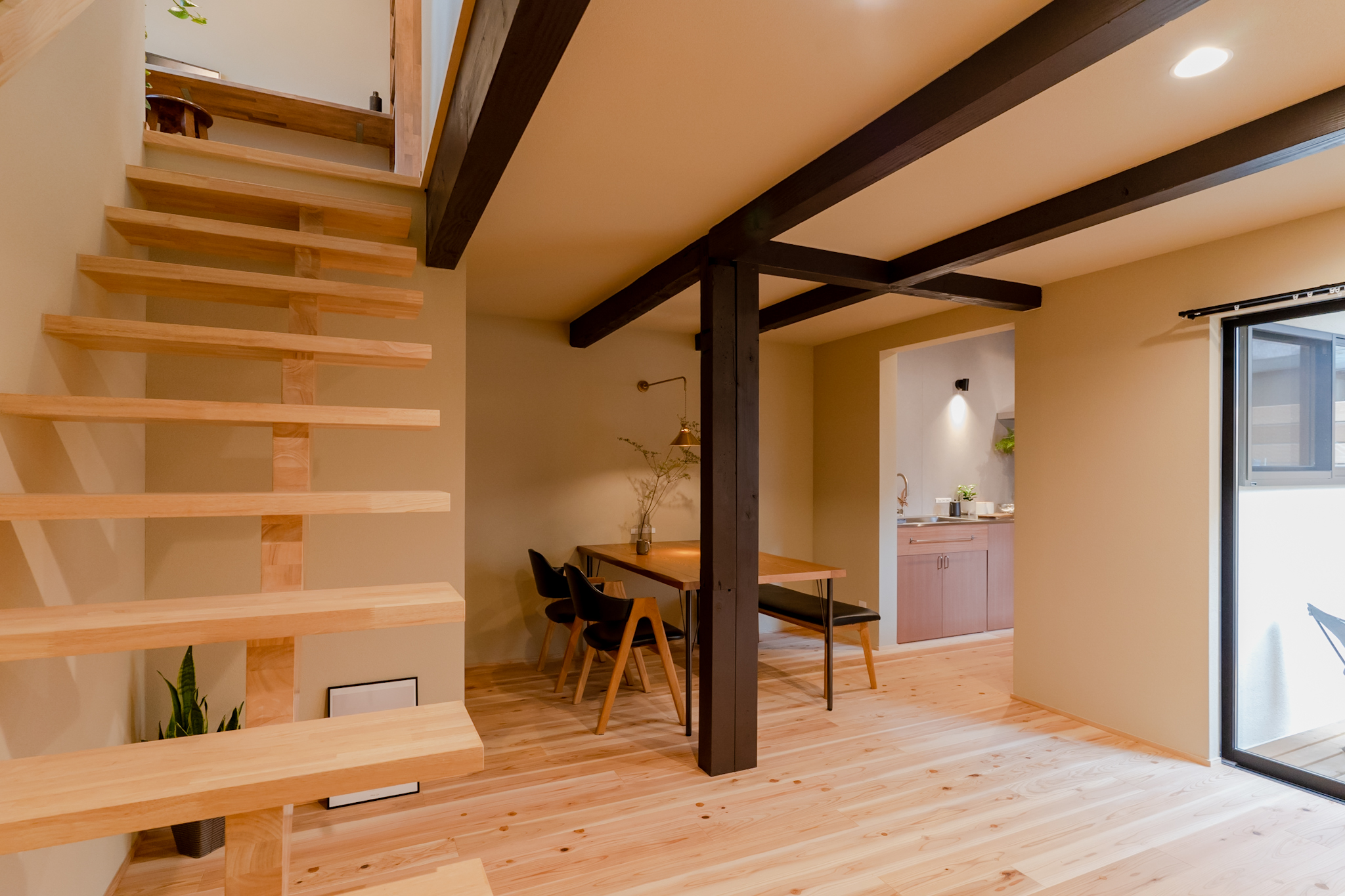 LDKに入ると、すぐ正面に坪庭の緑が目に飛び込む。リビングからウッドデッキと繋がった坪庭と、天井を従来より高くし梁を出したデザインにすることで、16帖とは思えない開放感を生みました。
