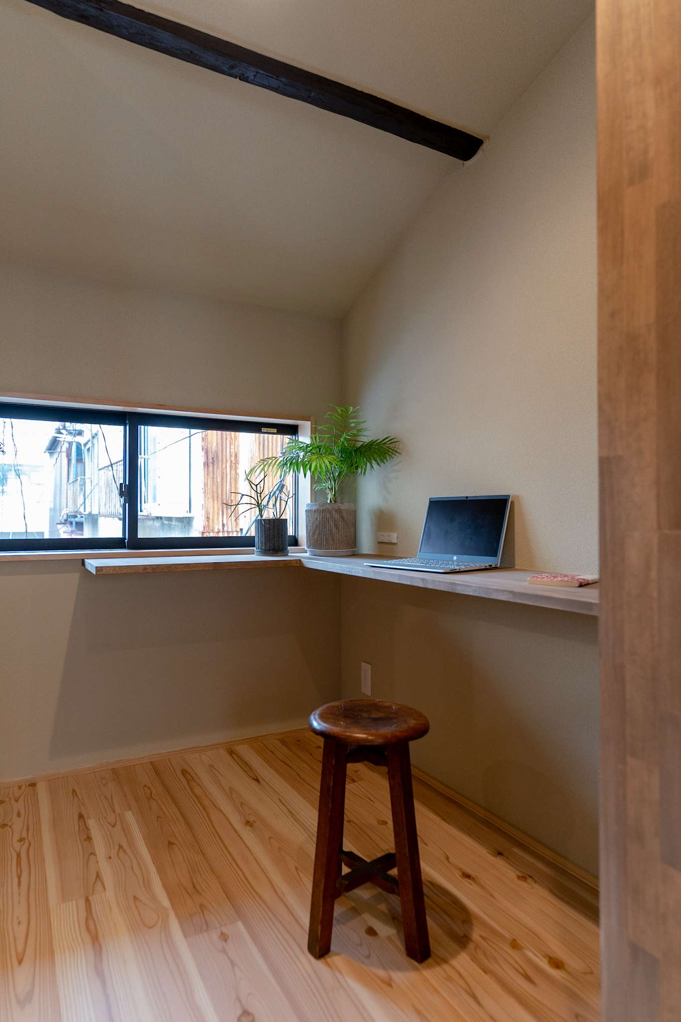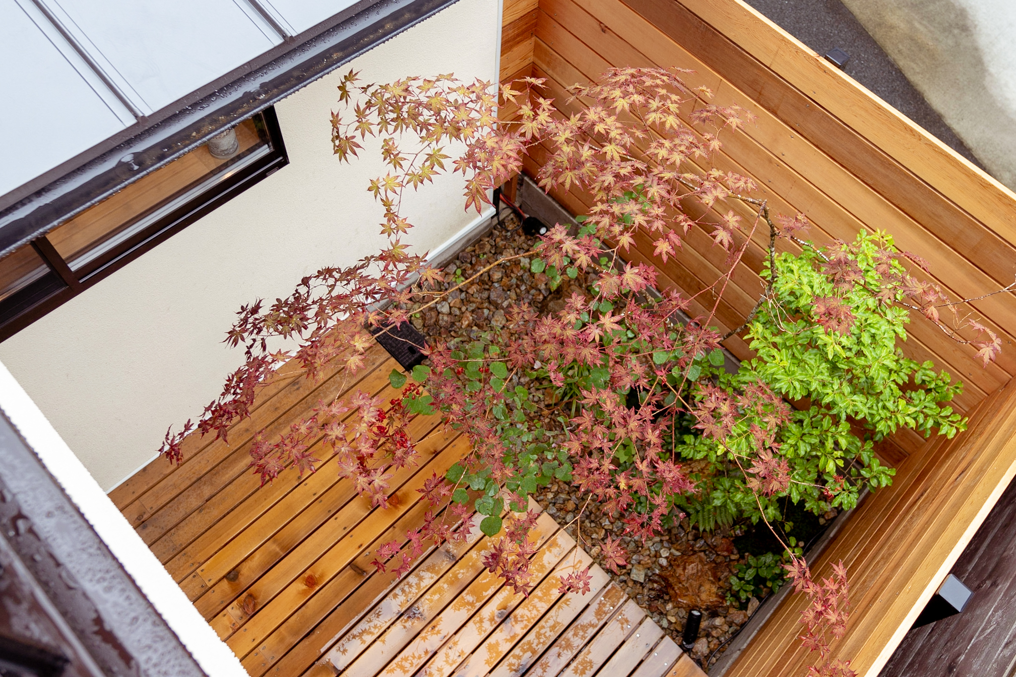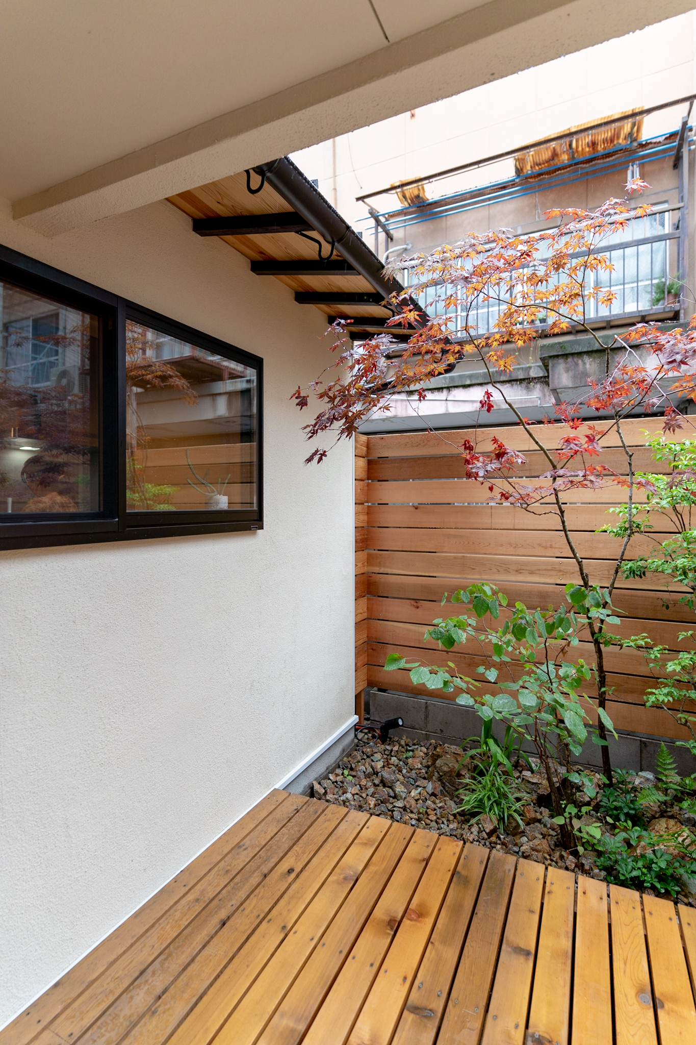 LDKに入ると、すぐ正面に坪庭の緑が目に飛び込む。リビングからウッドデッキと繋がった坪庭と、天井を従来より高くし梁を出したデザインにすることで、16帖とは思えない開放感を生みました。