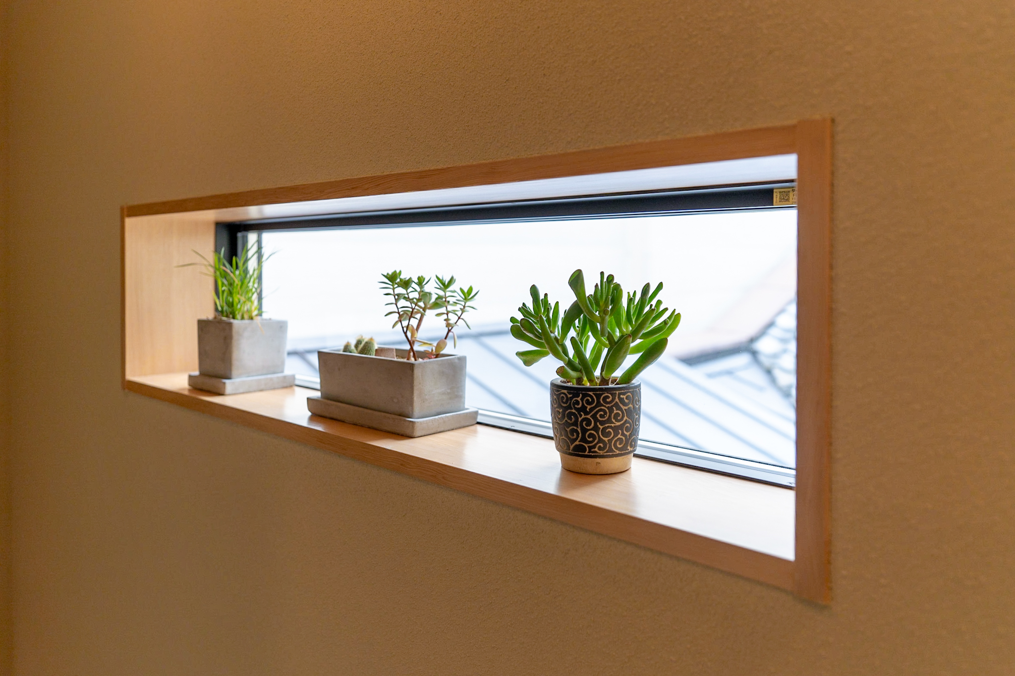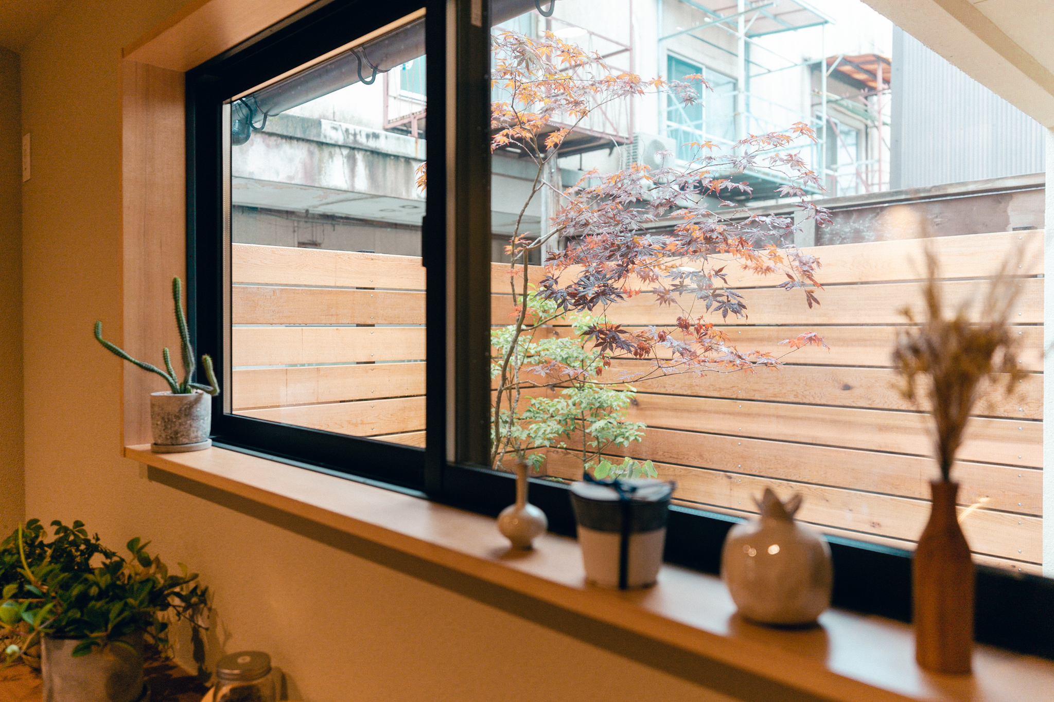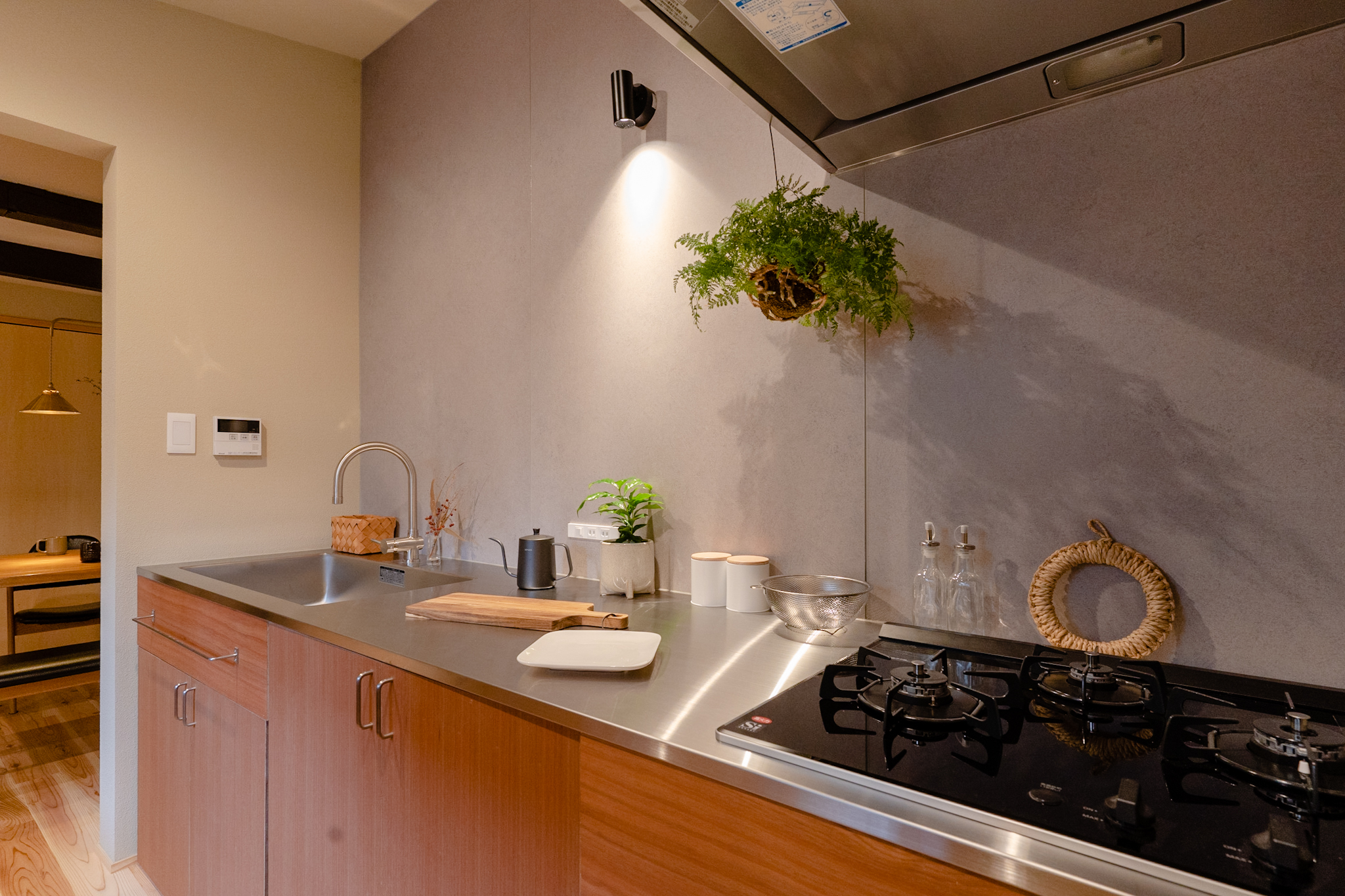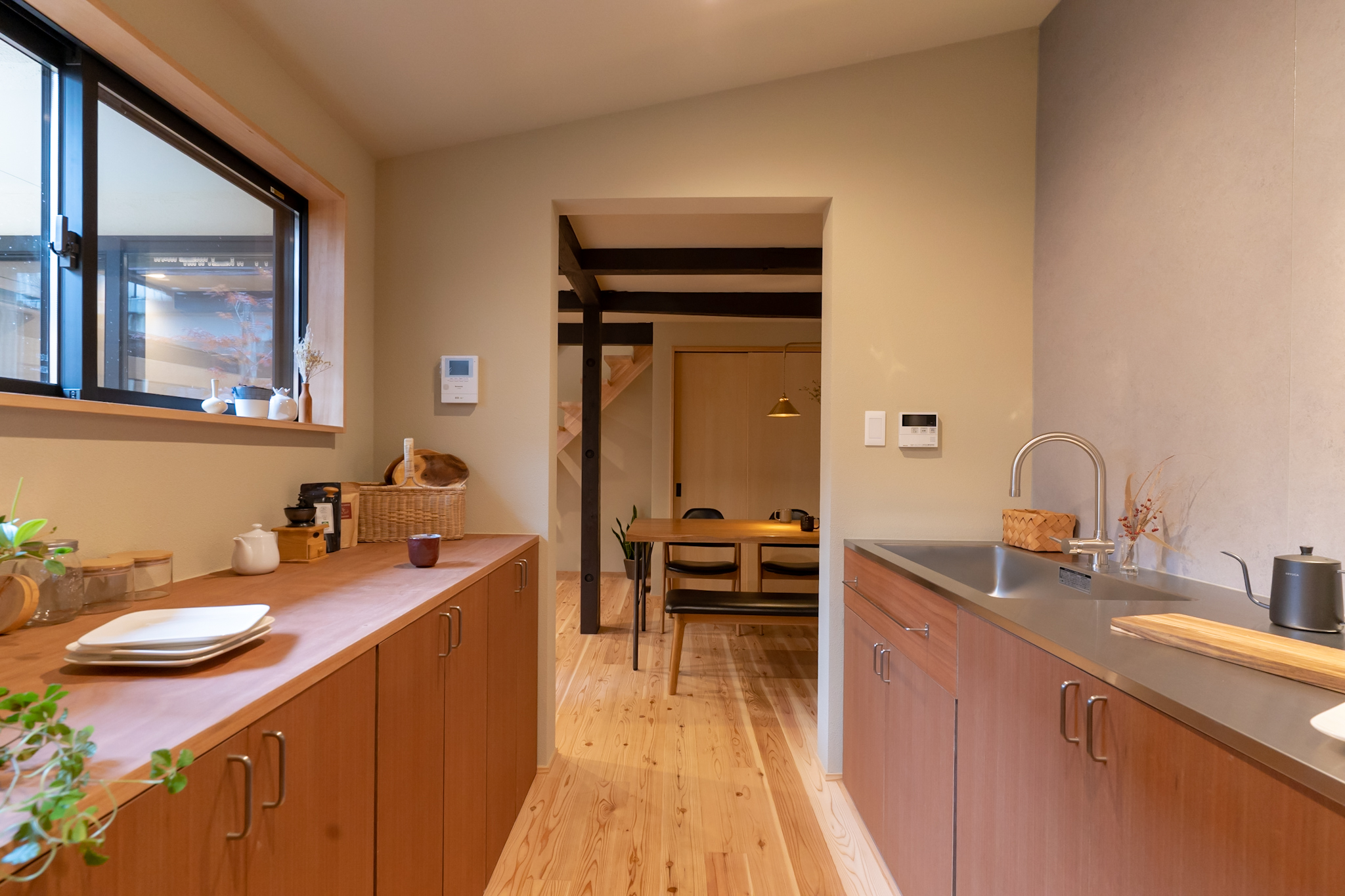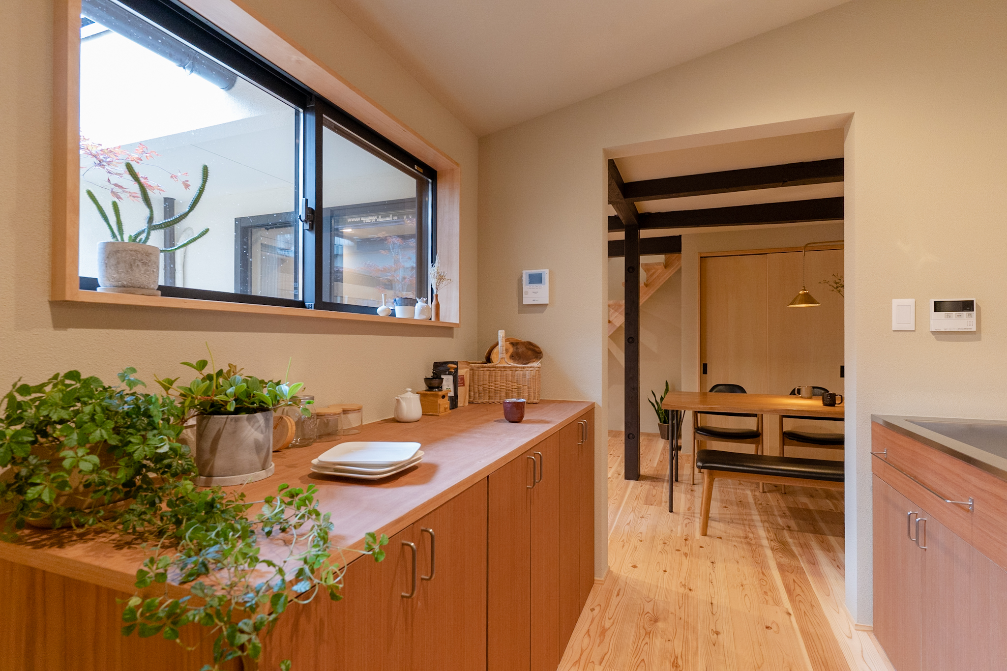シンプルな開口の奥には、大容量の収納を備えた造作の独立キッチン。こちらの窓からも坪庭を眺められ、季節の移ろいを感じながら料理を楽しめます。