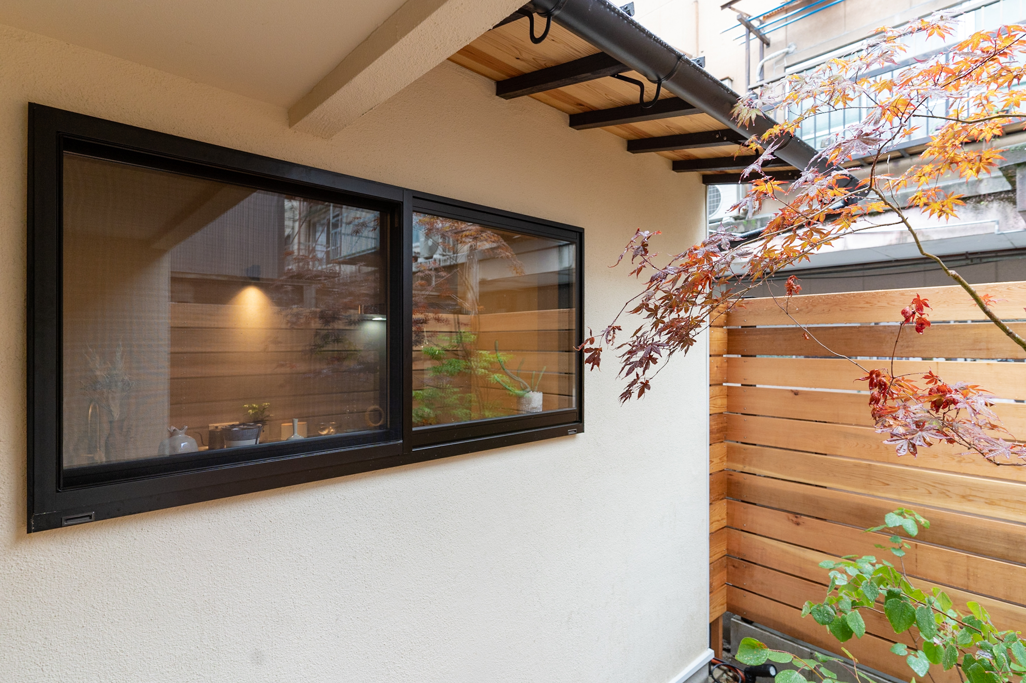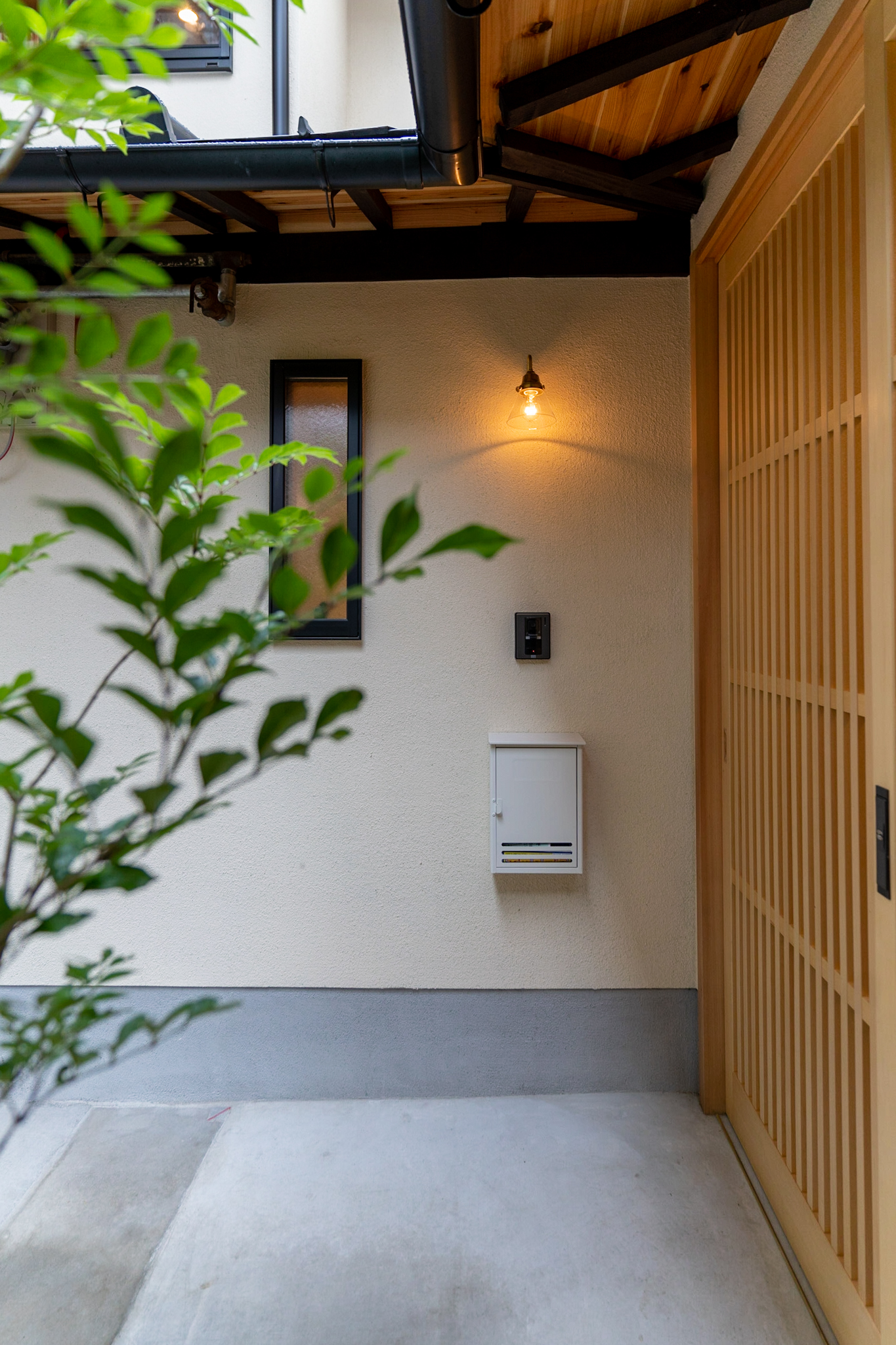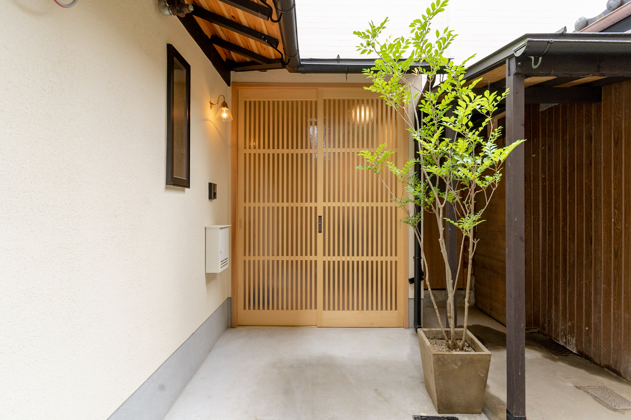 四方が家に囲まれた細い路地を通り抜けると、緑と共にある和風の玄関。
