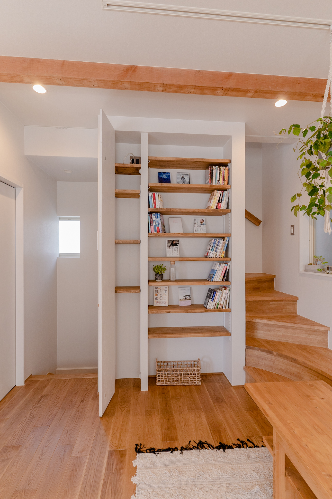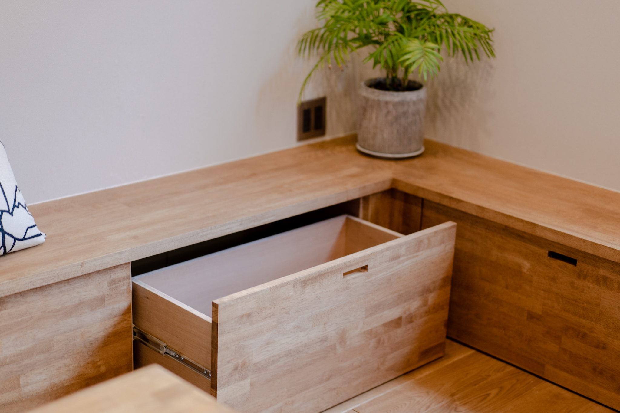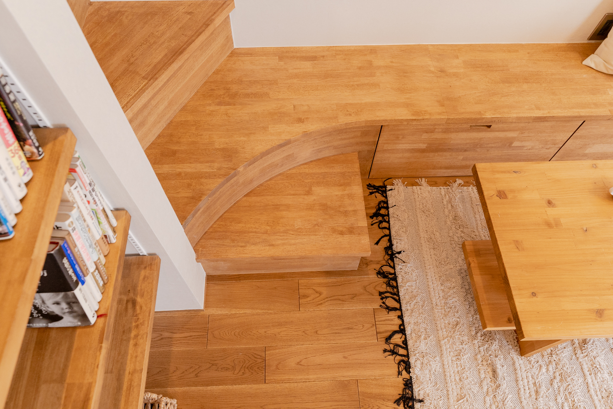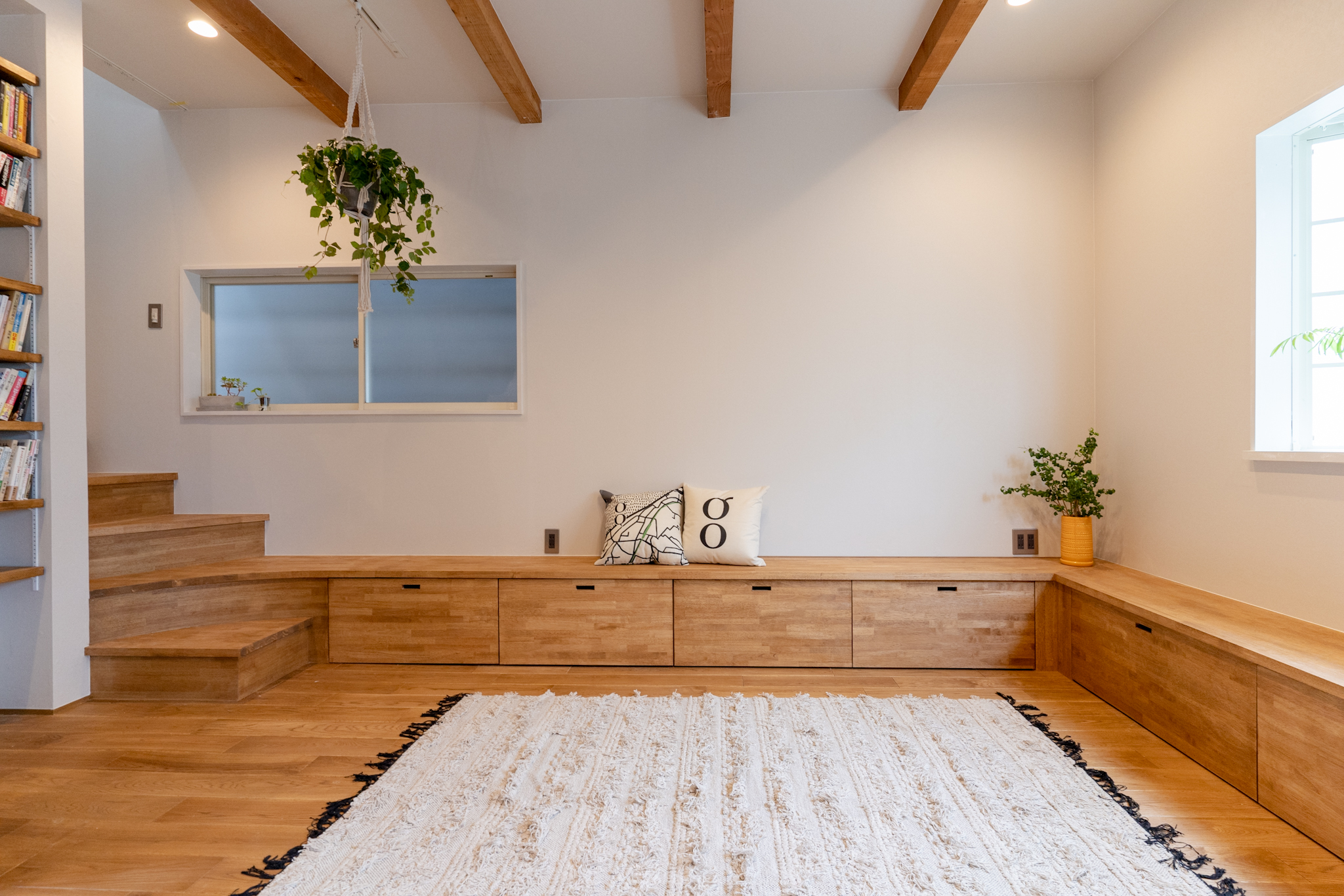 日差しがたっぷりと入る2Fは、階段とつなげたベンチと収納、TVボードの3役を担う造作家具を壁面に添って設置。LDKで散らかりがちな物を沢山収納でき、スッキリとした空間を保てます。