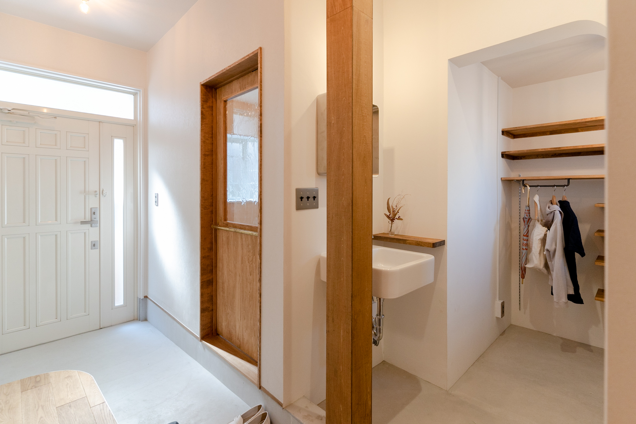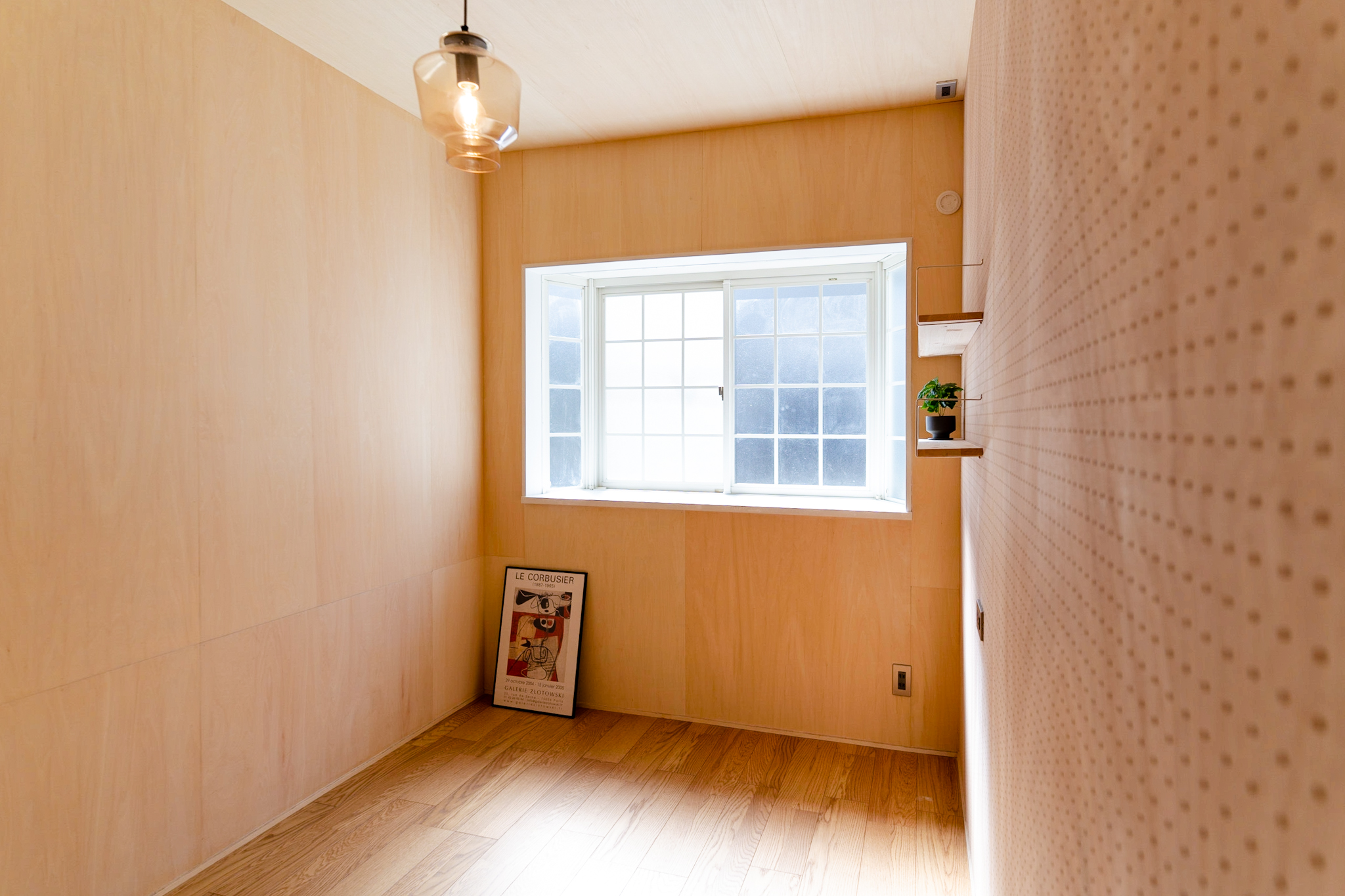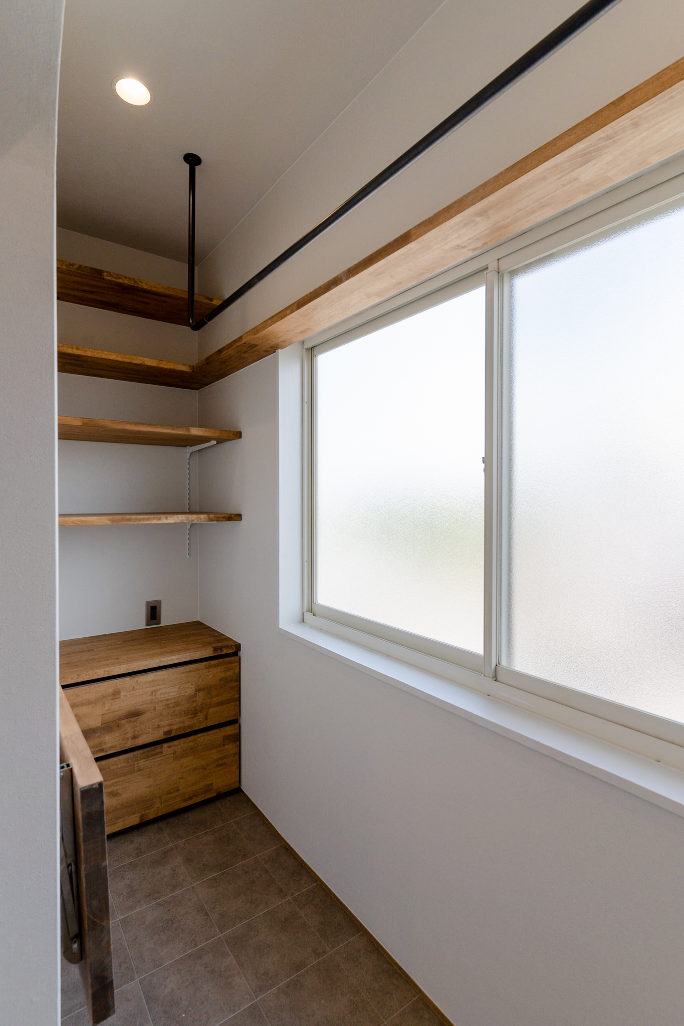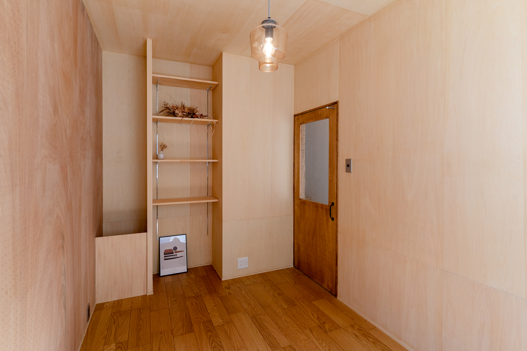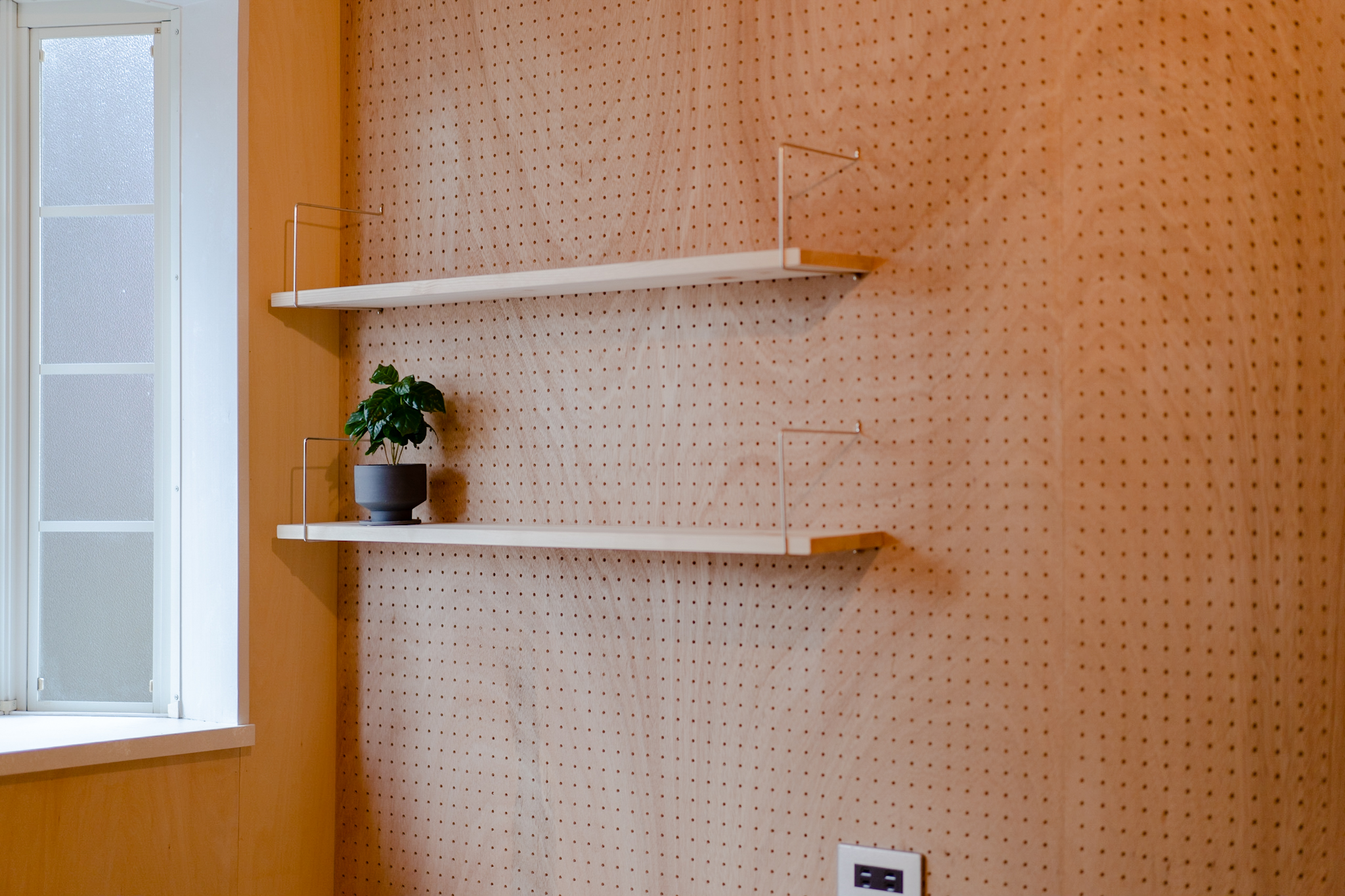 1Fは、ミシンをされる奥様のアトリエと玄関土間。アトリエのイメージは、学校の図工室のようにしたいということで全面板張りにし、棚や小物を引っ掛け作業しやすくするために1面だけ有孔ボードを使っています。