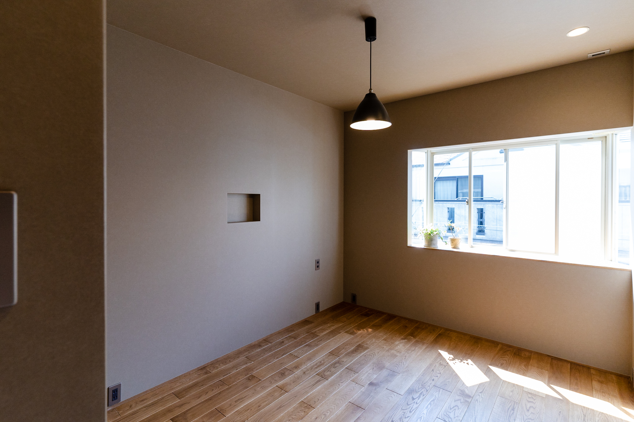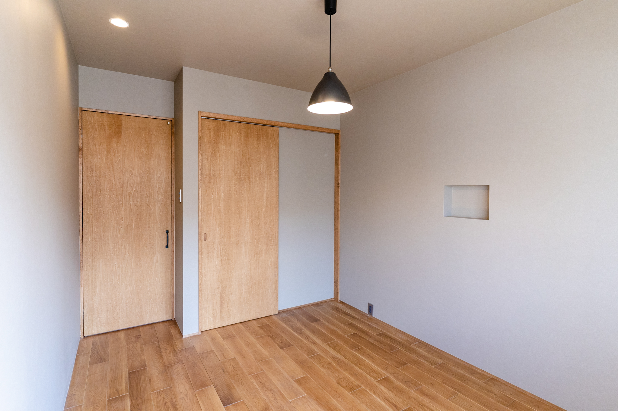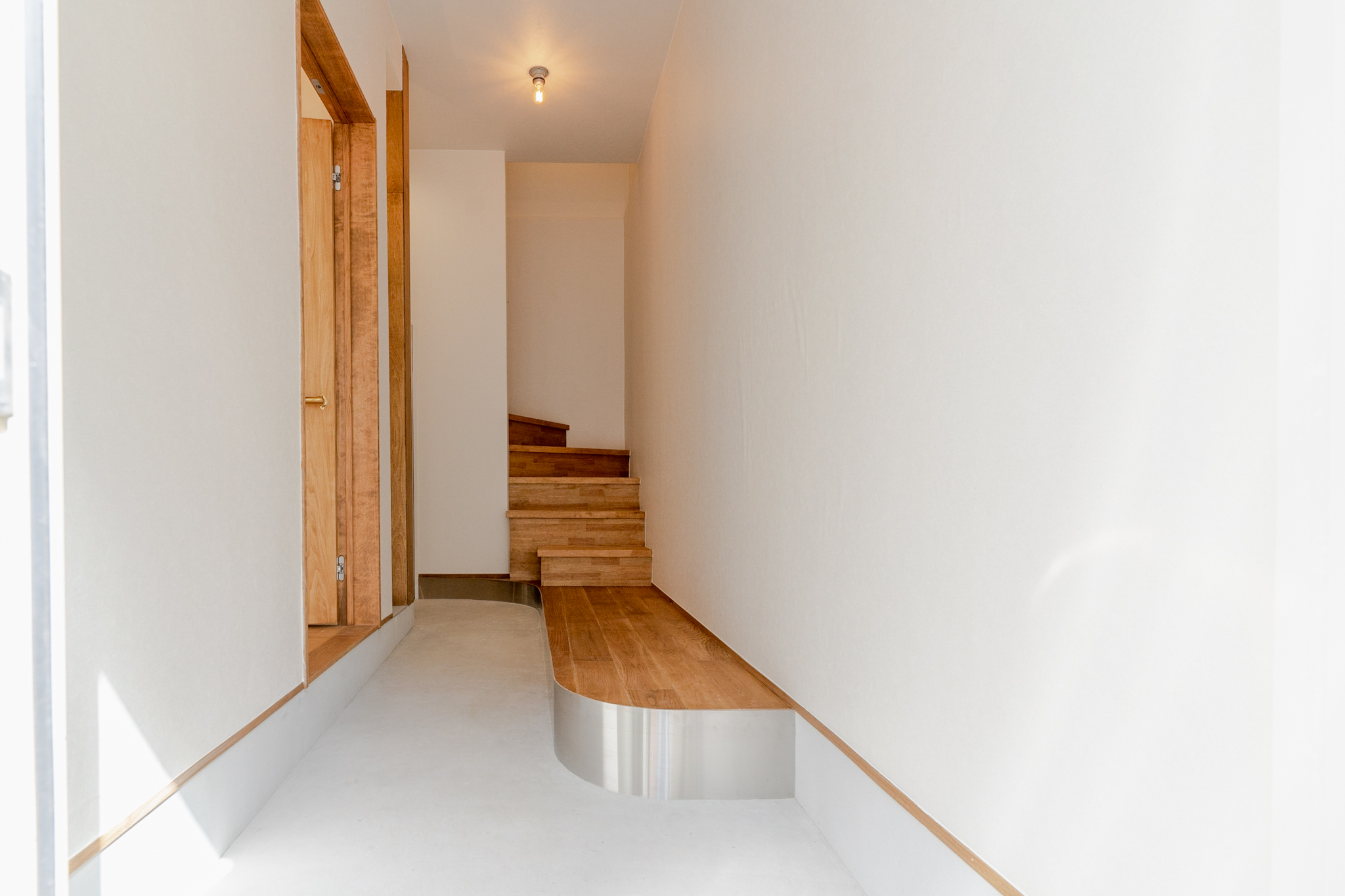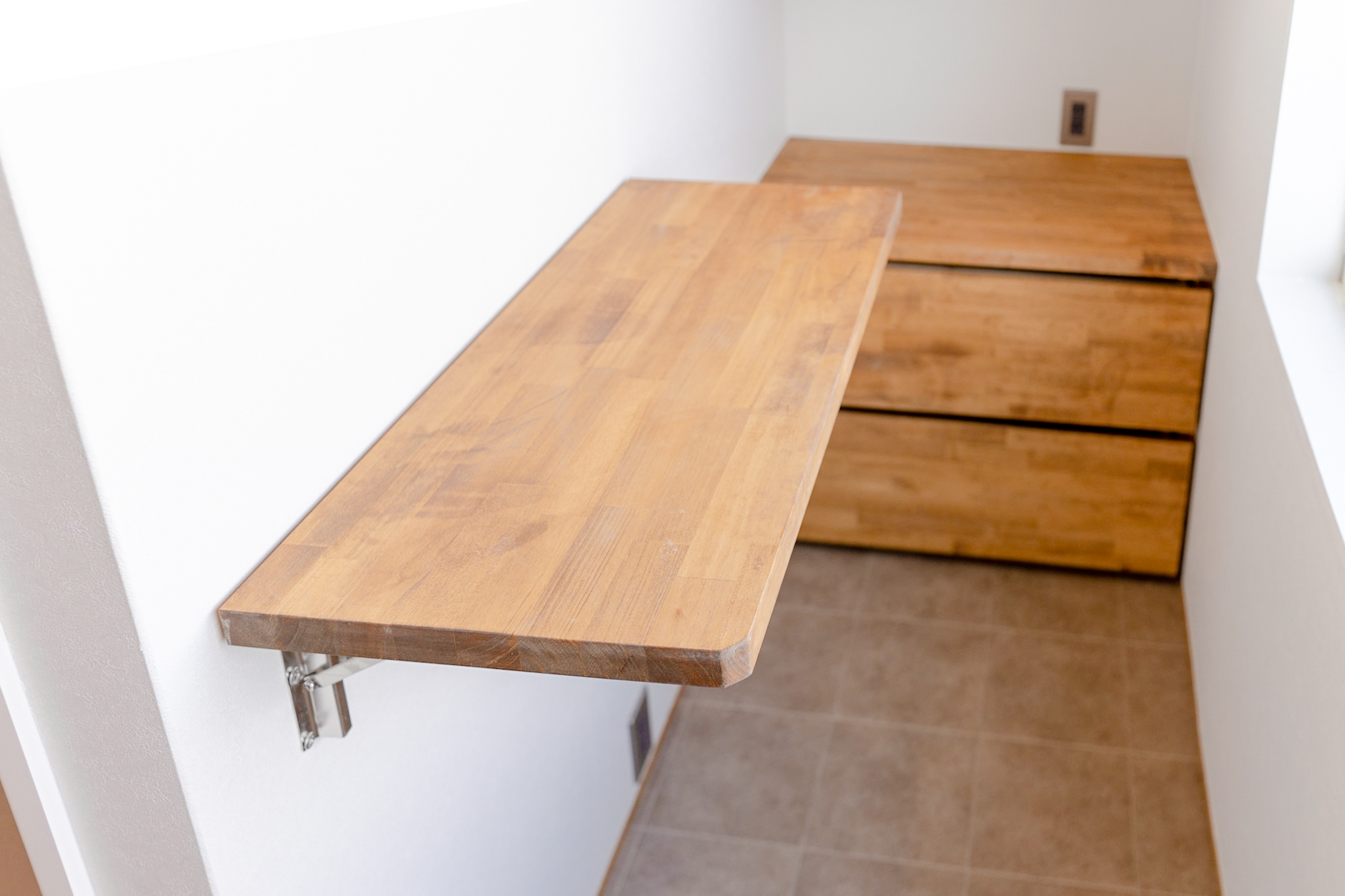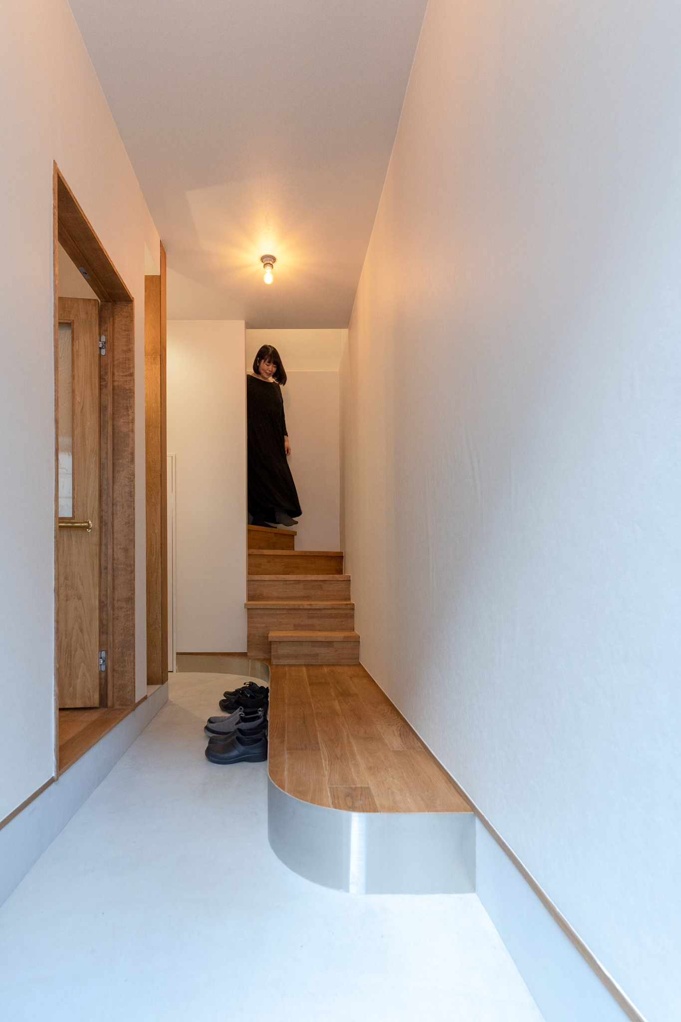 1Fは、ミシンをされる奥様のアトリエと玄関土間。アトリエのイメージは、学校の図工室のようにしたいということで全面板張りにし、棚や小物を引っ掛け作業しやすくするために1面だけ有孔ボードを使っています。